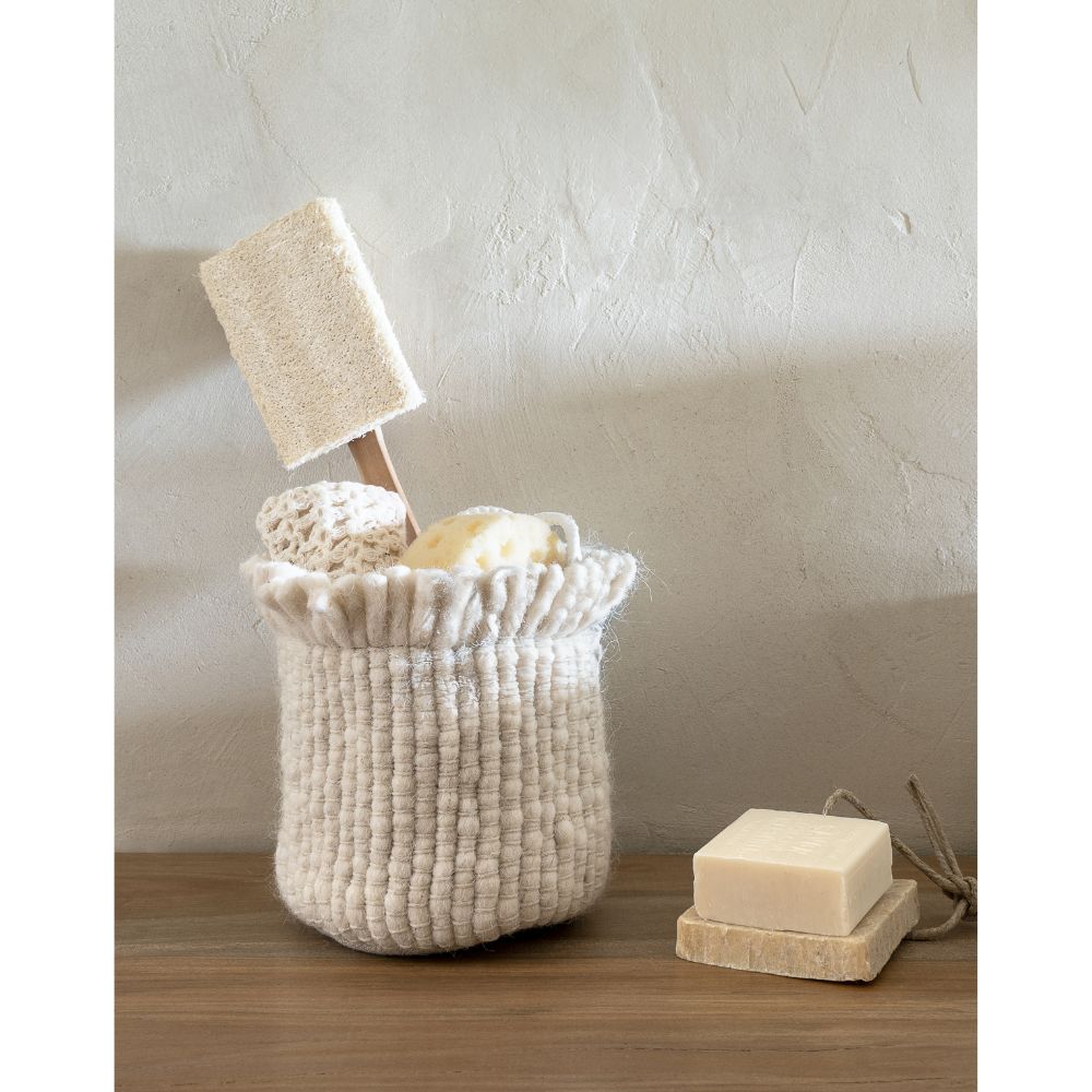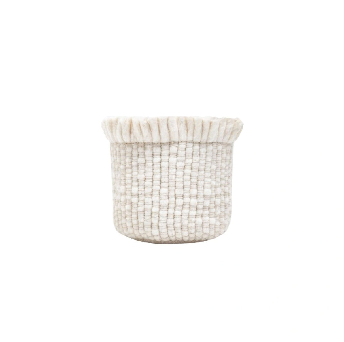 Panier tissé en grosse laine douce écru, finition franges épaisses.