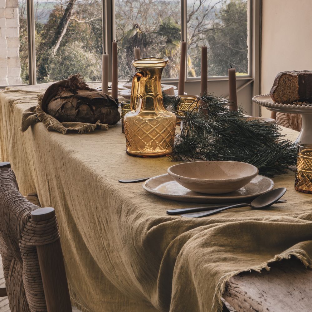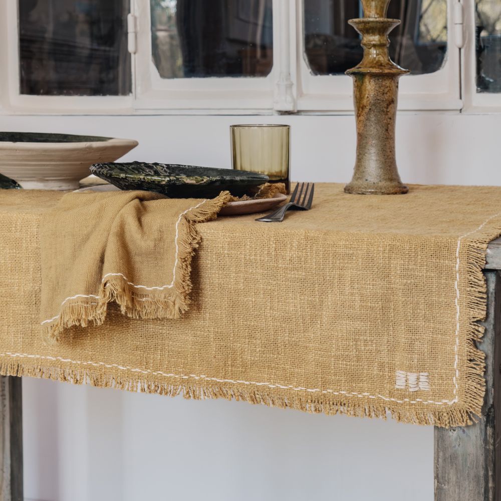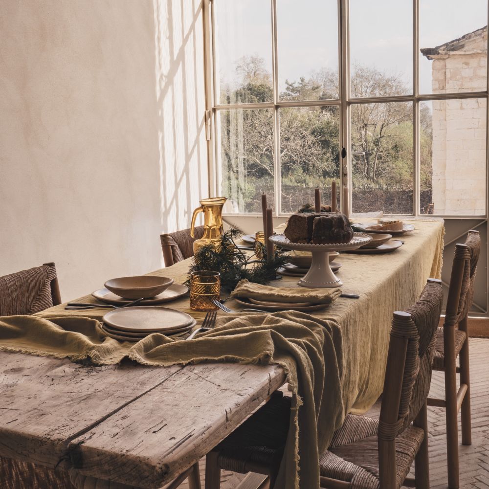 La nappe MATRIJANA2 en coton flammé adopte une finition frangée et une texture naturelle qui apportent un charme brut à vos repas. Son coloris Grano, lumineux et chaleureux, se marie parfaitement avec les teintes du thème MAMA MIA. Avec ses dimensions généreuses (170×250 cm), elle est idéale pour recevoir en toute simplicité. À coordonner avec les serviettes MARINARA pour un ensemble harmonieux.