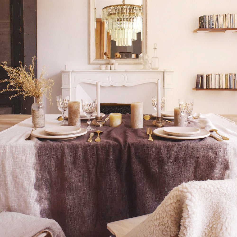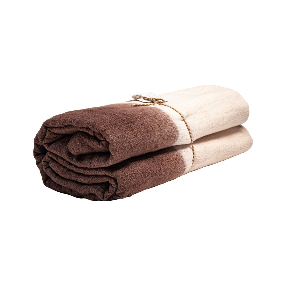 Nappe en coton flammé épais, teinture tie and dye coloris ébène sur fond écru.