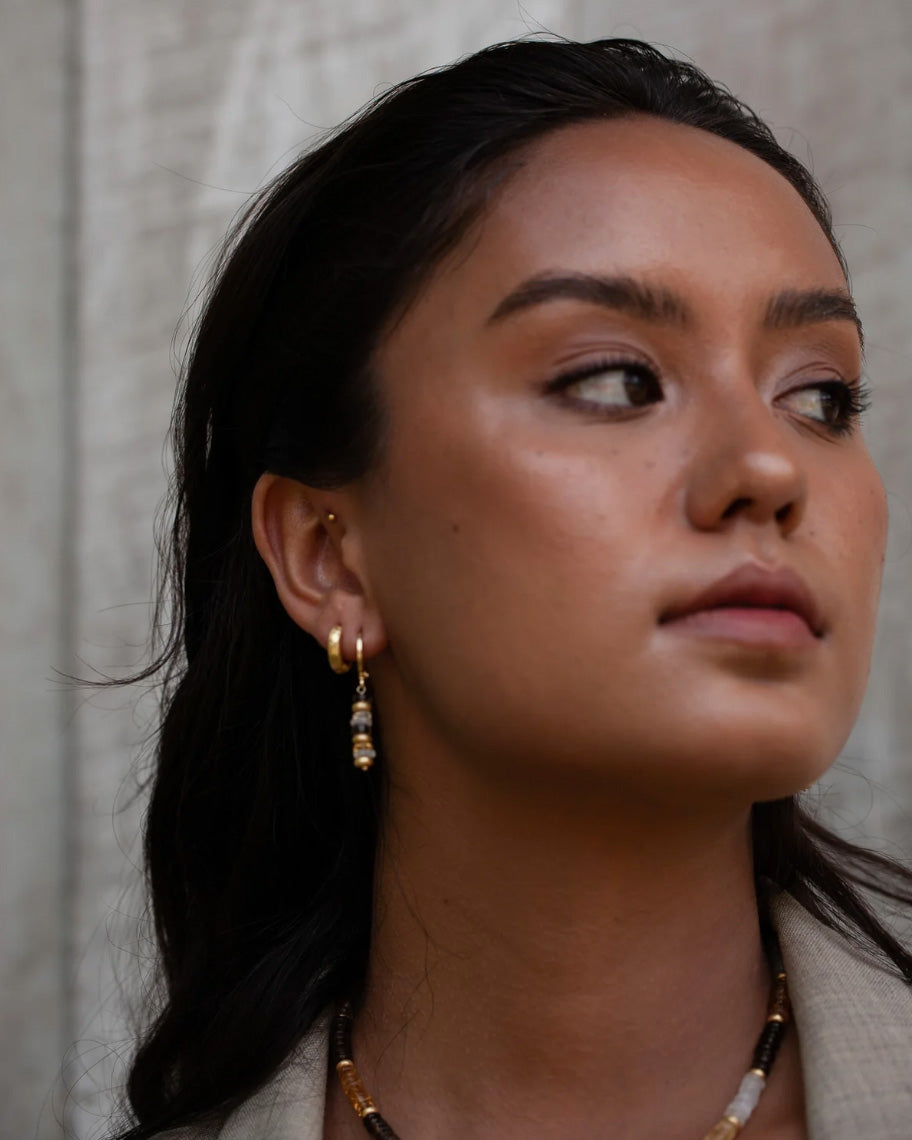 Chaque pièce est ornée de pierres naturelles, rendant chaque bijou unique par la variation subtile des formes et des couleurs.