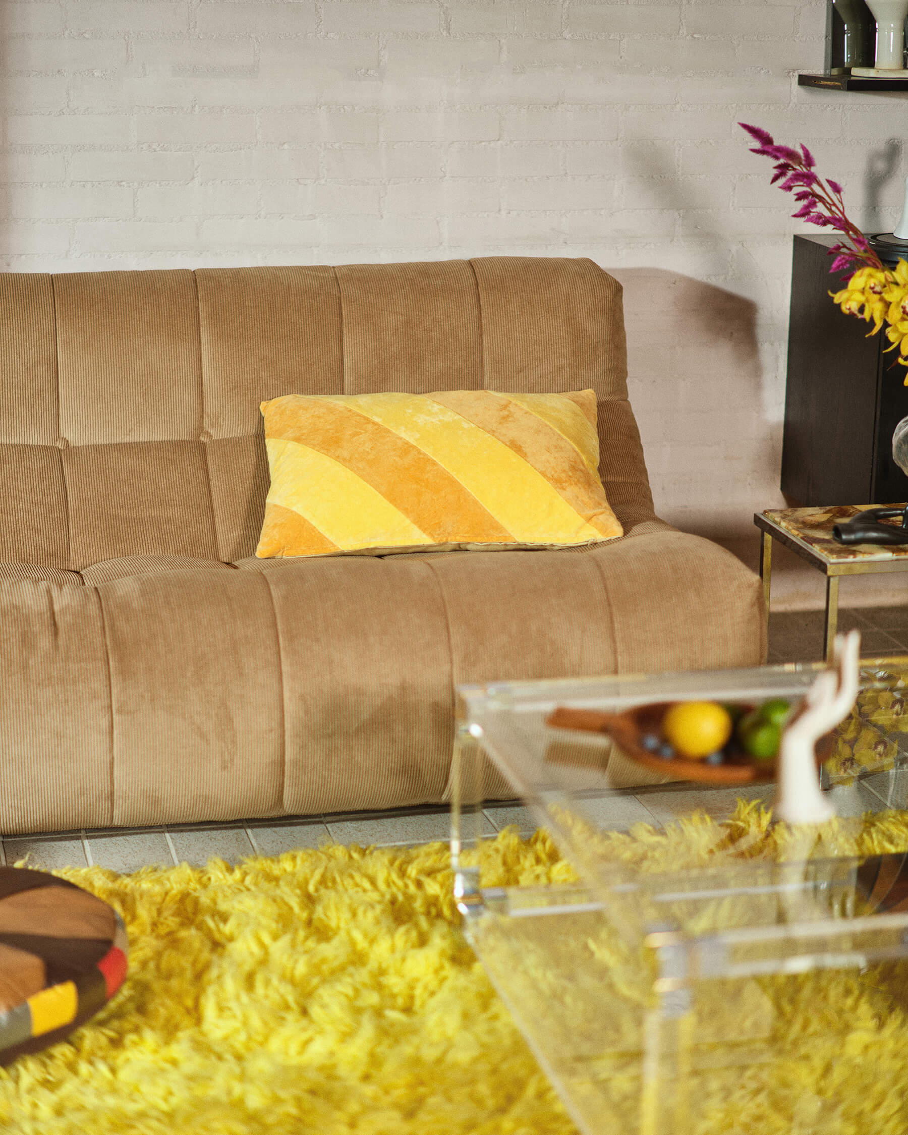 Qu'il s'agisse d'ajouter une touche de couleur à une pièce sobre ou de créer un coin cosy dans votre espace extérieur, le design de ce coussin présente des rayures audacieuses qui alternent entre un citron acidulé et un jaune doré plus profond, rappelant les premiers rayons du soleil perçant à travers une fraîche matinée de printemps.