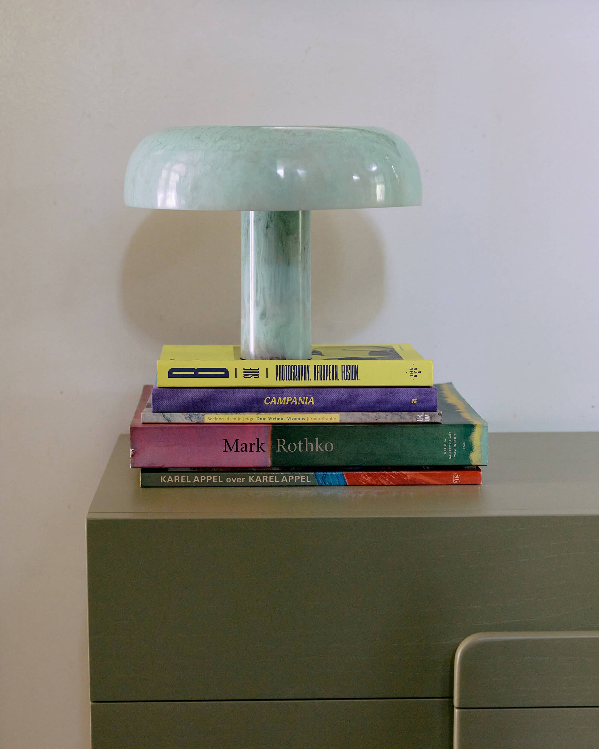 Pied tubique et abat-jour "plateau", en résine lég§remeent marbrée, vert mint et blanc.