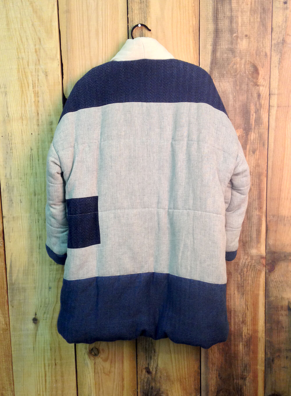 Très confortable, parfaite en demi-saison mais également pour l'hiver. en patchwork de toile chevrons de différents tons, écru/ ciel / indigo. Grand col châle relief, 2 poches coutures côtés, fermeture milieu devant par grosses pressions métal .