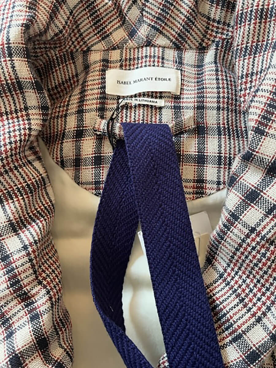en toile de lin tartan, coloris navy & rouge sur fond écru.