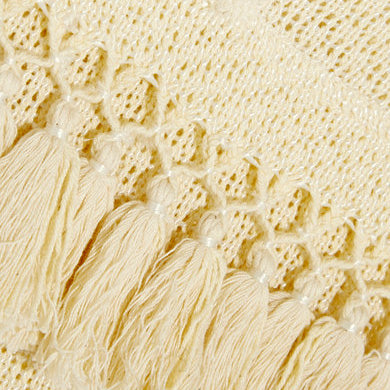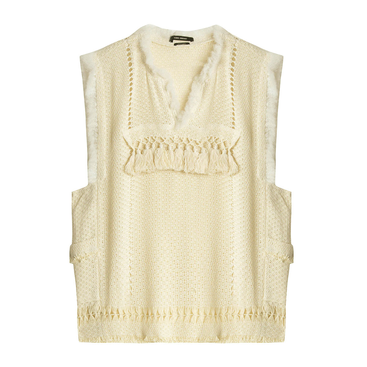 Haut inspiré des tuniques traditionnelles Berbères, en crochet aéré de coton mélangé, finitions frangées. 2 poches côtés.