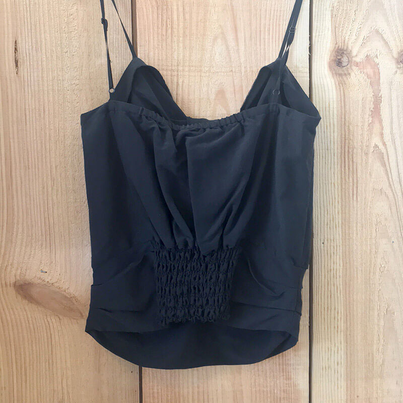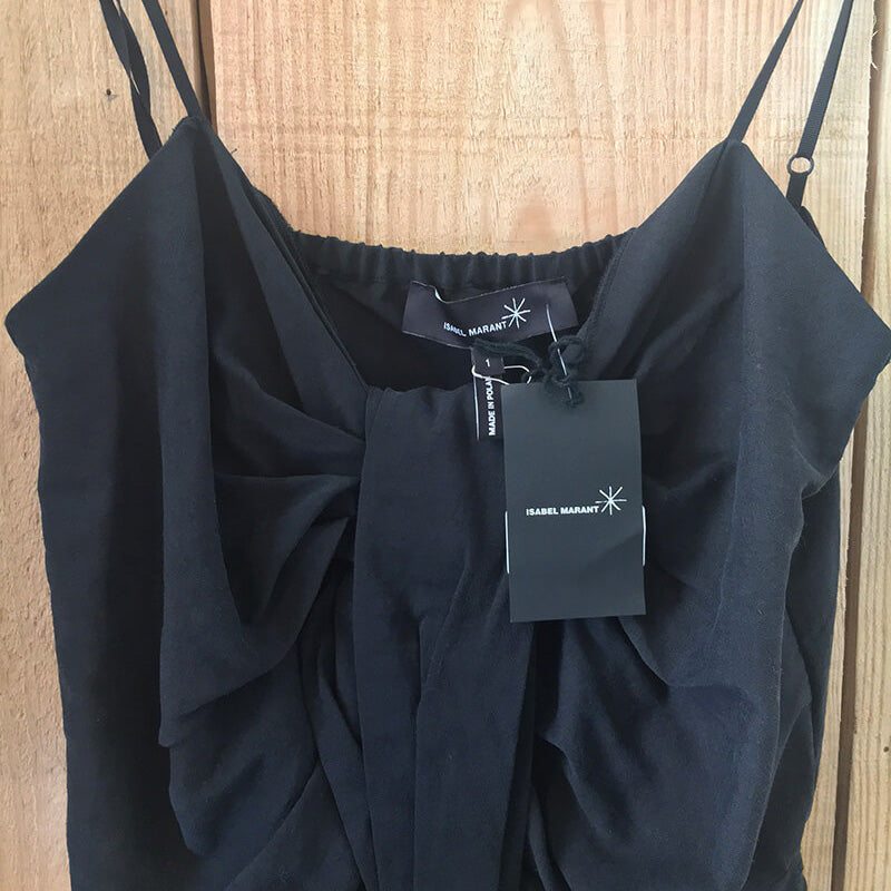 Buste noué, ceinture large légèrement drapée devant , élastiquée au dos.