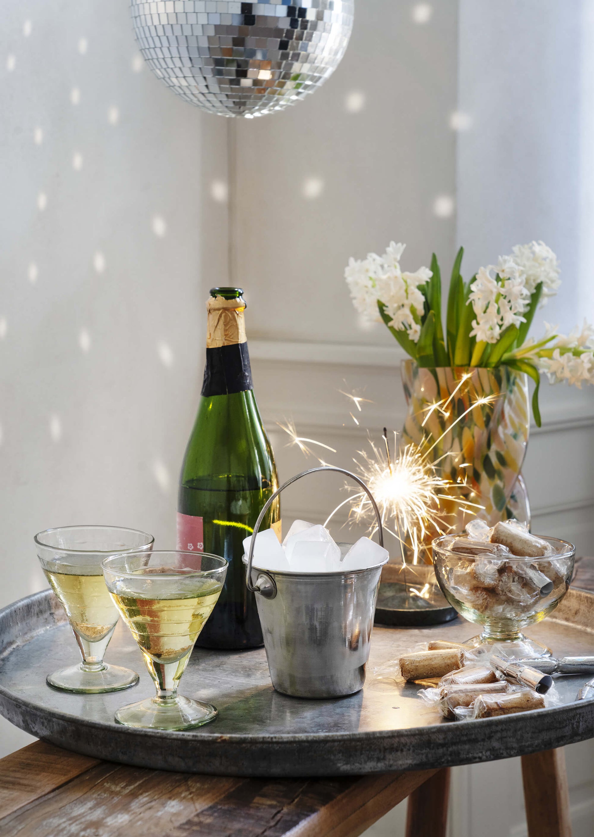 Vase en verre torsadé style 50s, transparent avec pois multicolores.