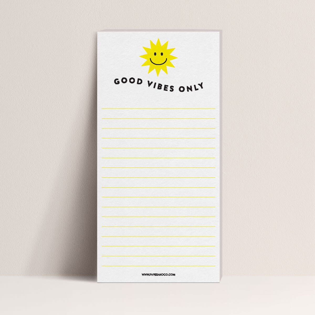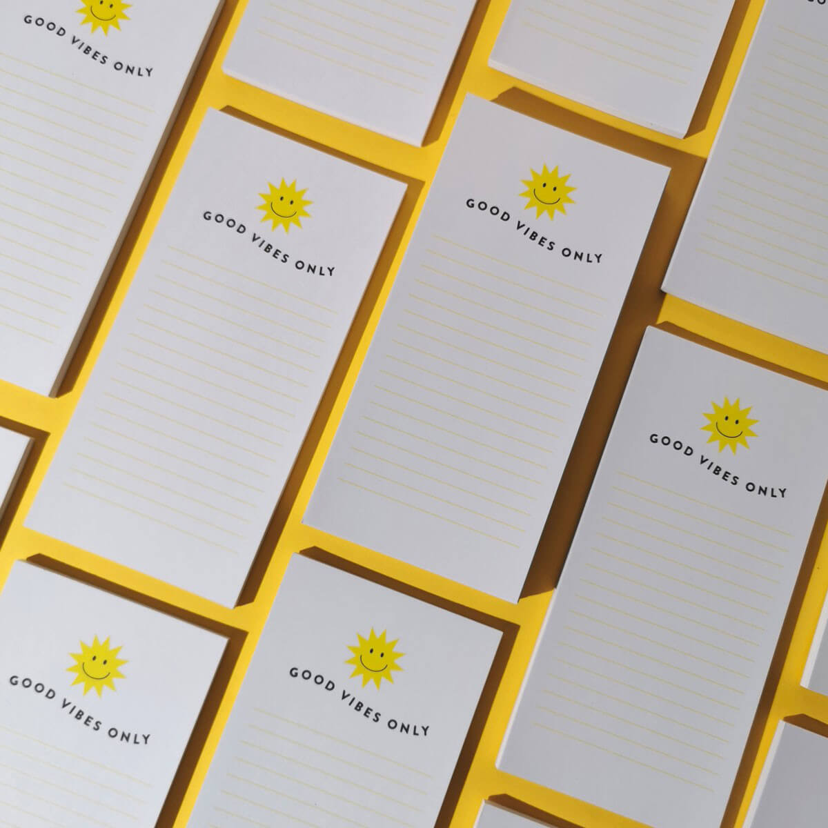Le Bloc notes Good vibes Only avec notre emblématique Soleil vous mettra du baume au cœur et permettra que votre liste de choses à faire soit réalisée dans une positive attitude absolu.