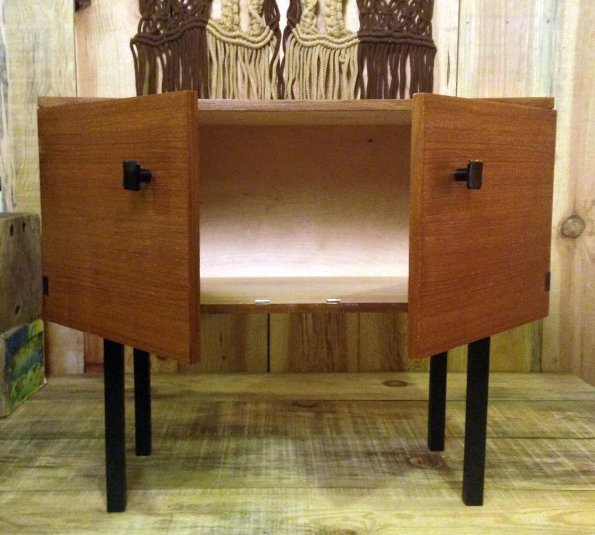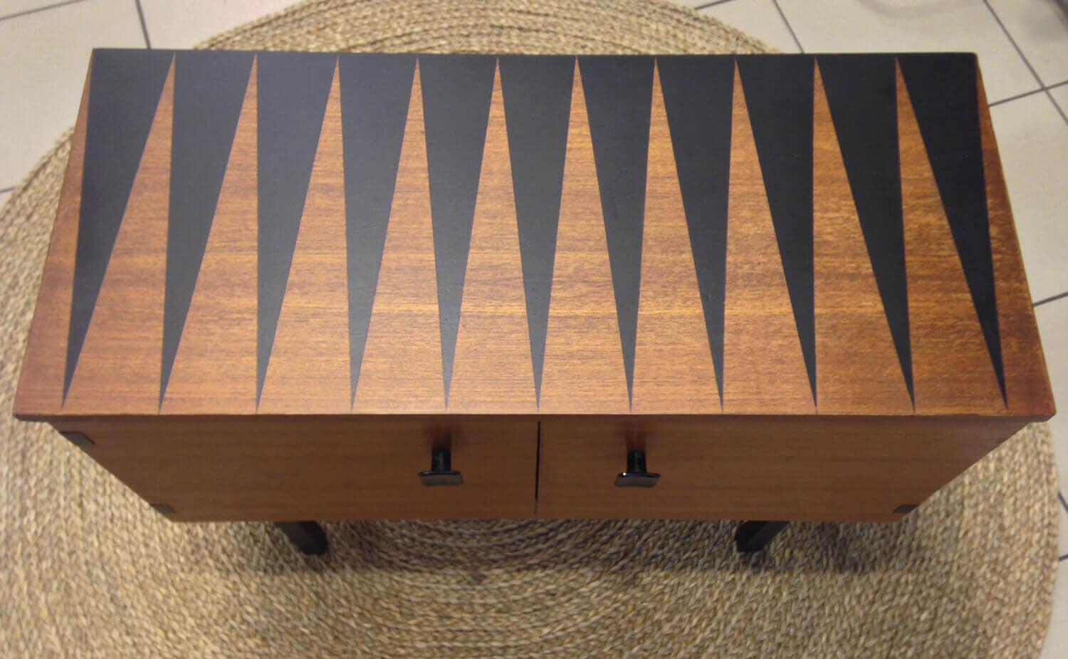 Plateau peint à la main motif Backgammon noir, finition vitrificateur satiné aqueux. Pieds bois peints et poignées d'origine restaurés.