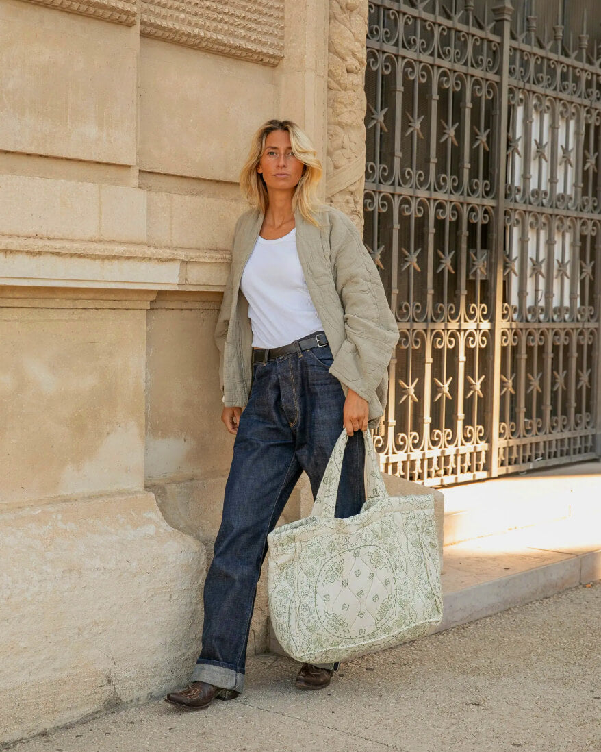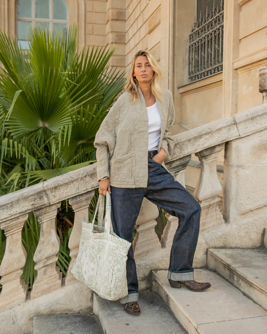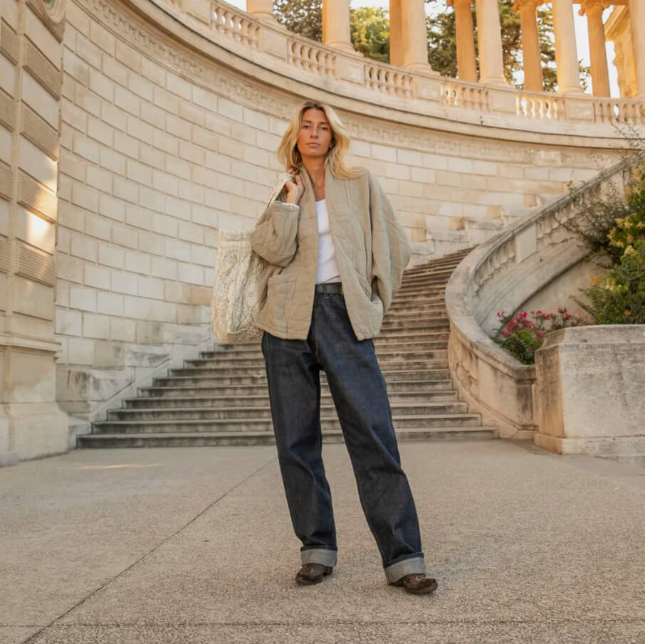 On adore la matière, facile à vivre, et la coupe déstructurée facile à porter, en demi-saison ou en été, associé à un jean, short ou sur une robe.