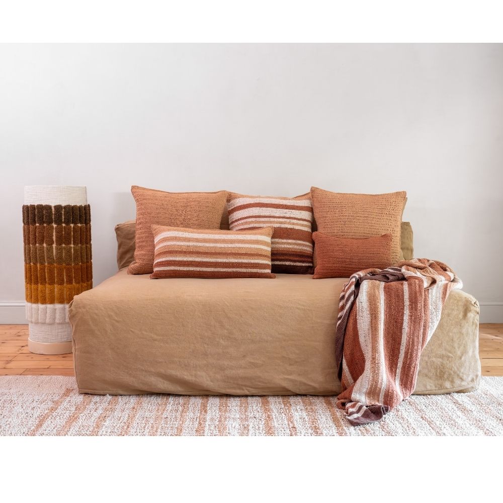 TIERRA DEL SOL est une collection en coton crocheté à la main. Chaque plaid est unique, marqué par son geste artisanal. Ses teintes terreuses (Sienna, Sand, Cusco) rappellent l’éclat d’un désert espagnol et apportent chaleur et authenticité à l’intérieur.