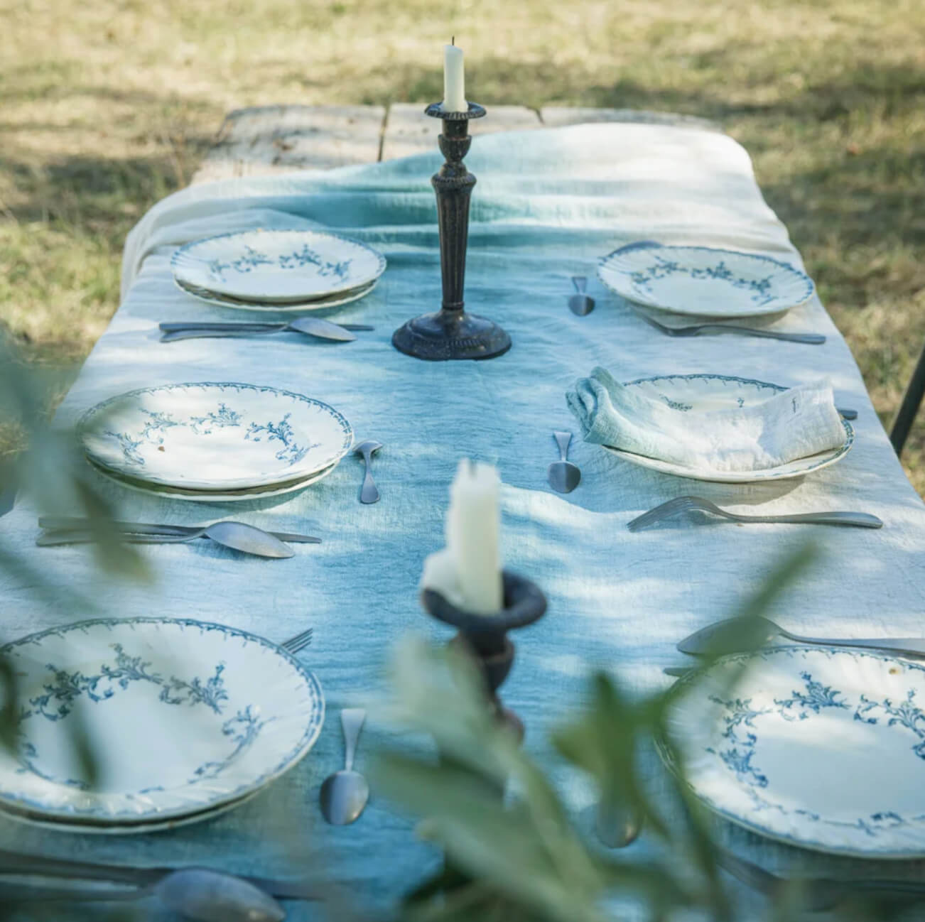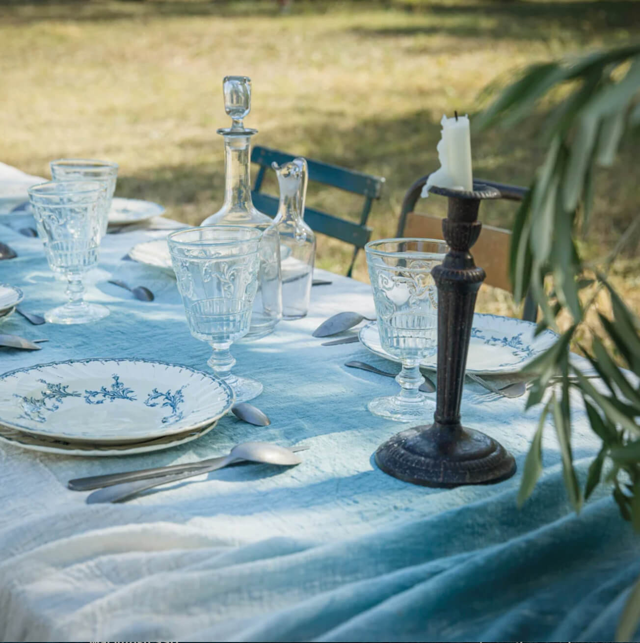 Nappe en coton flammé épais, teinture tie and dye coloris turquoise clair sur fond écru.
