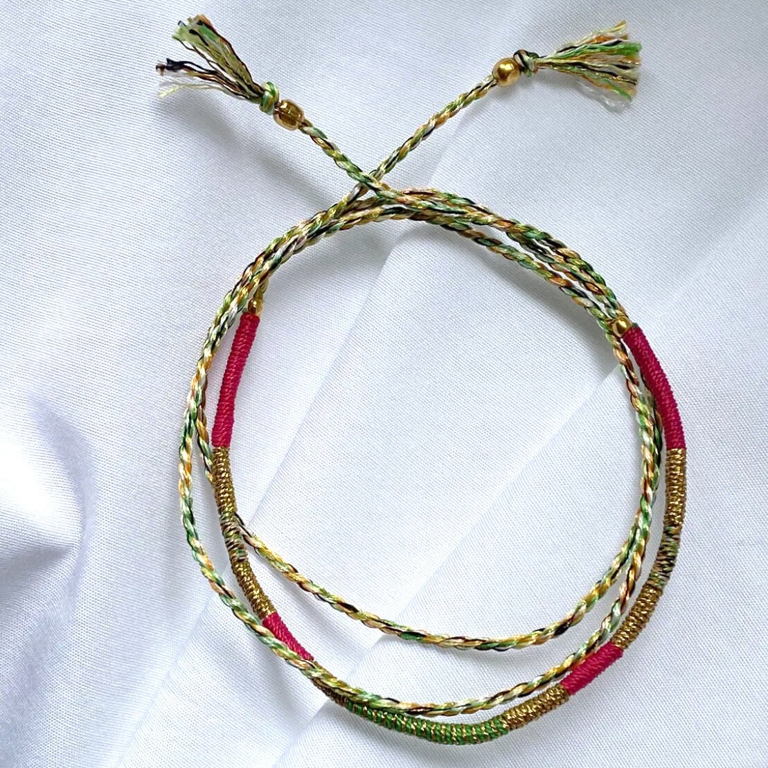 Bracelet-cordon multicolore avec fils métal & petites perles plaquées or.