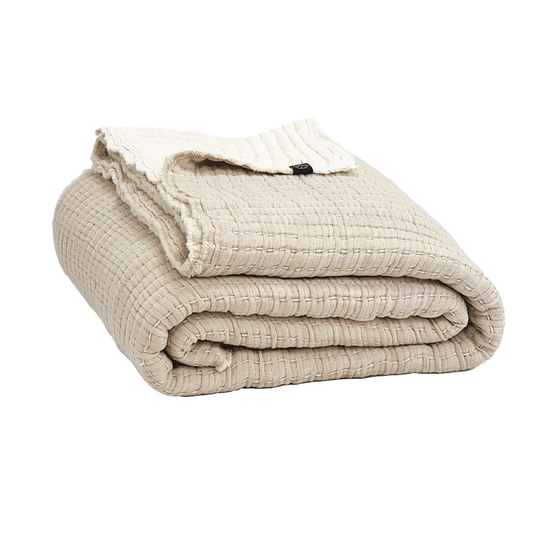 Le caractère artisanal du modèle Tivoli réside dans ses finitions haut de gamme : il arbore un point Kanta (surpiqûre traditionnelle) qui structure le tissu et une finition frangée sur tout le pourtour pour un look bohème-chic assumé. Il s'utilise aussi bien en jeté de canapé pour vos moments de détente qu'en couvre-lit élégant pour sublimer votre chambre à coucher.