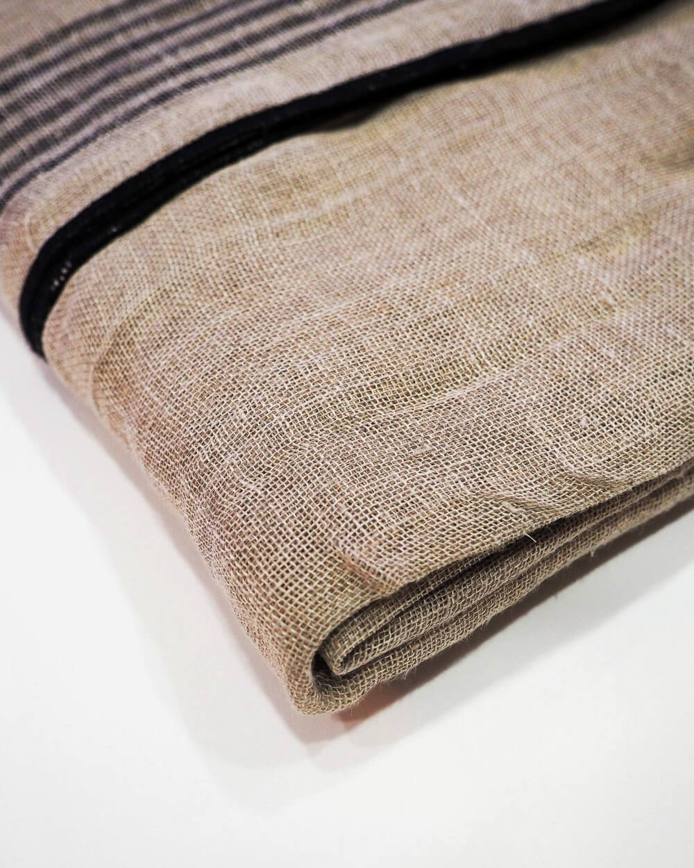 Rayures tissées contrastes noires aux côtés, avec finition piquée large point bourdon noir.