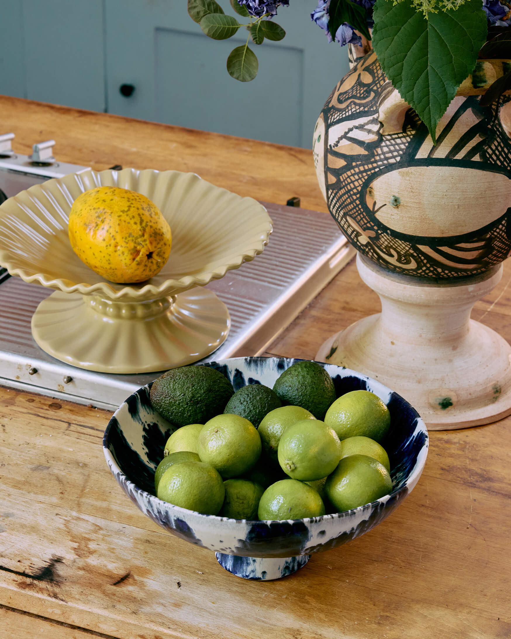 Audacieux, ce bol en céramique arbore un motif expressif d'éclaboussures indigo sur un fond blanc immaculé, évoquant presque une peinture en mouvement. Reposant sur un pied sculptural, il se suffit à lui-même tout en s'harmonisant parfaitement avec des services de table minimalistes ou colorés. Une pièce fonctionnelle à la touche créative.