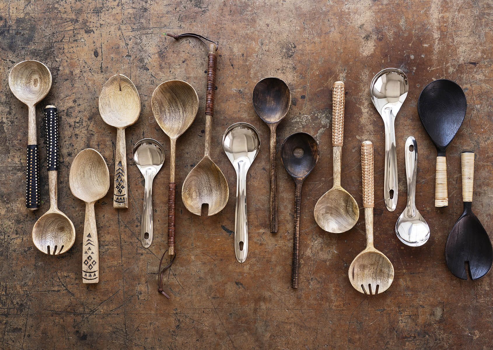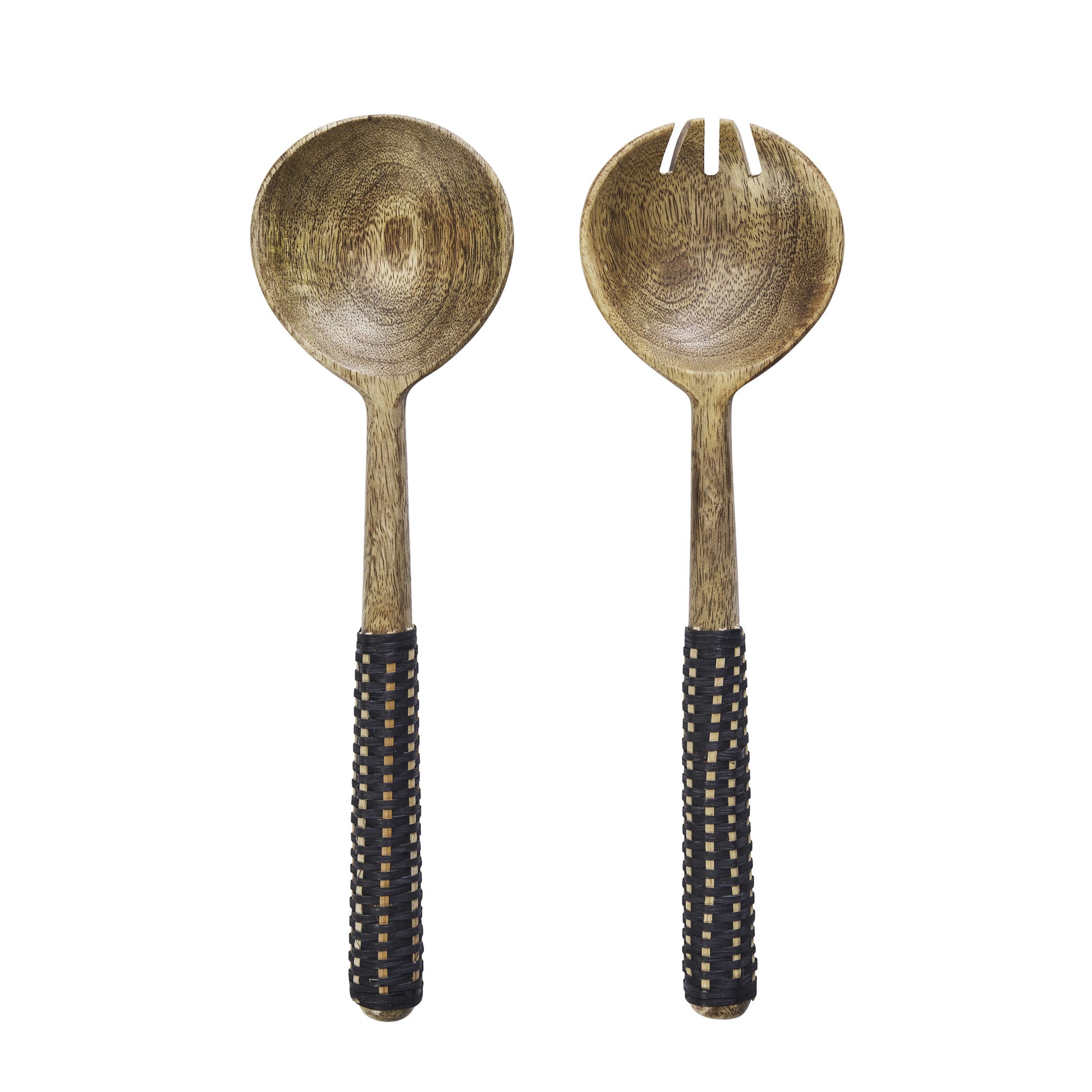 Ce service à salade sculpté à la main, est en bois de manguier et orné de poignées en rotin. Chaque pièce arbore des teintes naturelles et noires uniques, lui conférant une touche distinctive. Ce service de deux pièces est idéal pour un service élégant, alliant matériaux naturels et design intemporel..