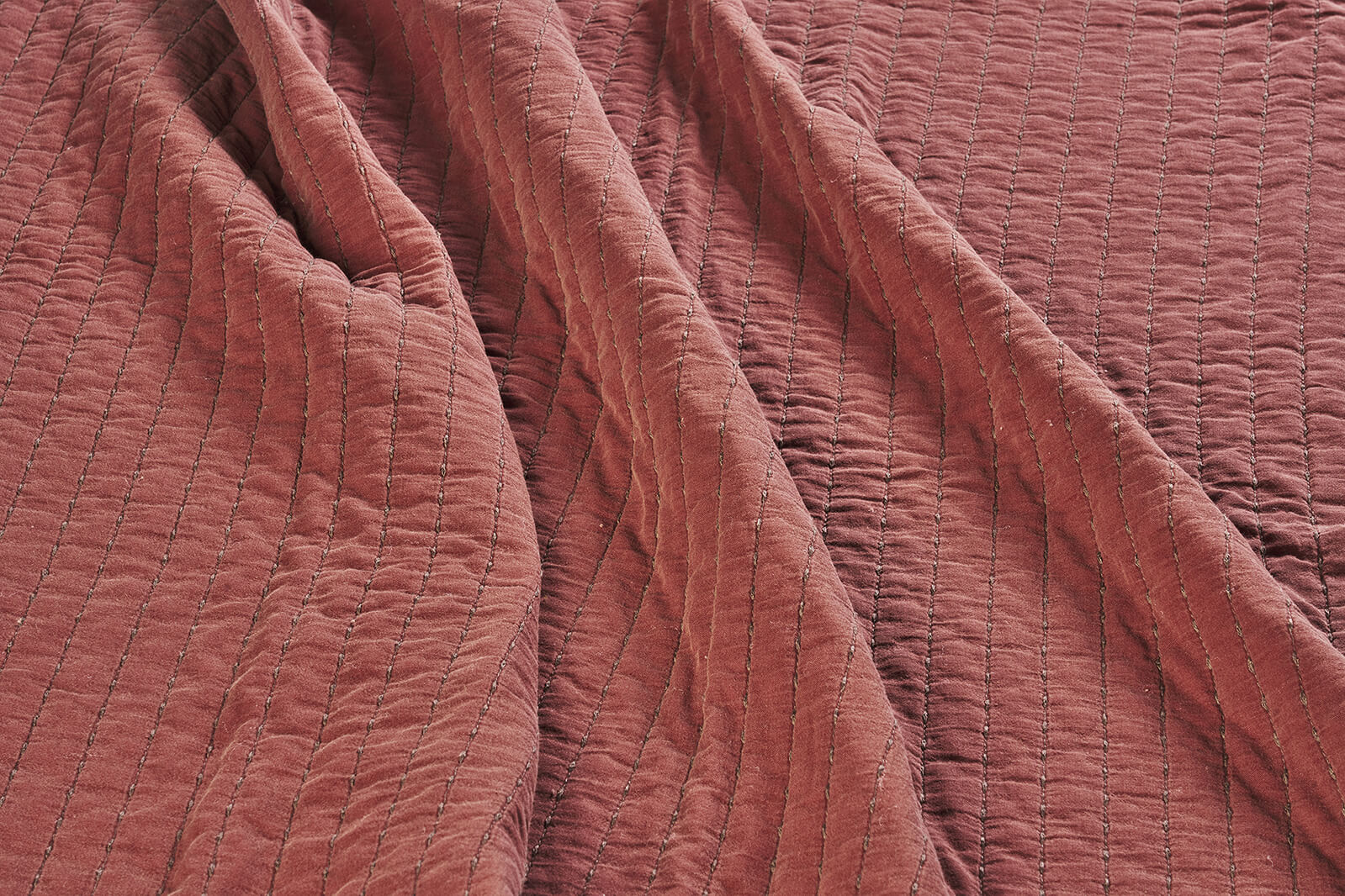 Ce couvre-lit en coton matelassé dans de riches teintes brique et marron, il est délavé pour une douceur et une subtilité incomparables. À associer avec des coussins pour une ambiance chaleureuse.