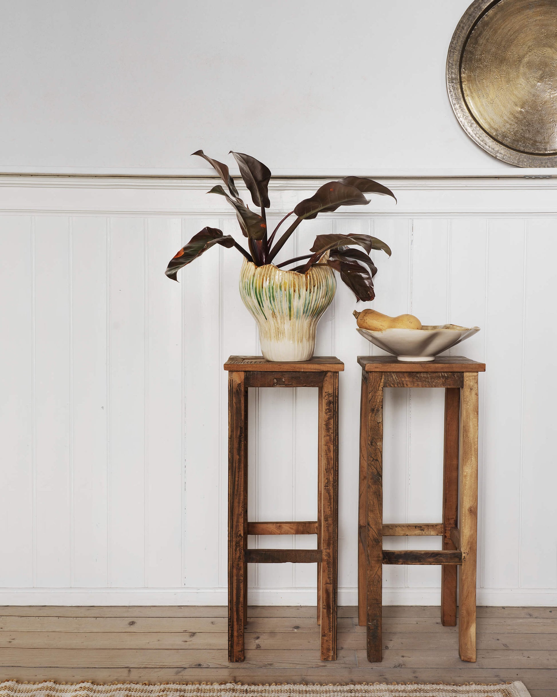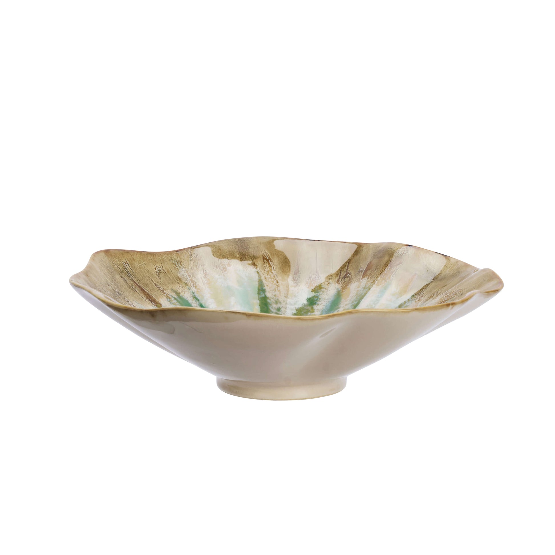 Ce bol en grès présente une forme ondulée unique et un décor réalisé à la main. Son émail réactif beige, vert et blanc cassé confère à chaque pièce un caractère unique. Idéal comme corbeille à fruits, il allie fonctionnalité et inspiration Art déco.