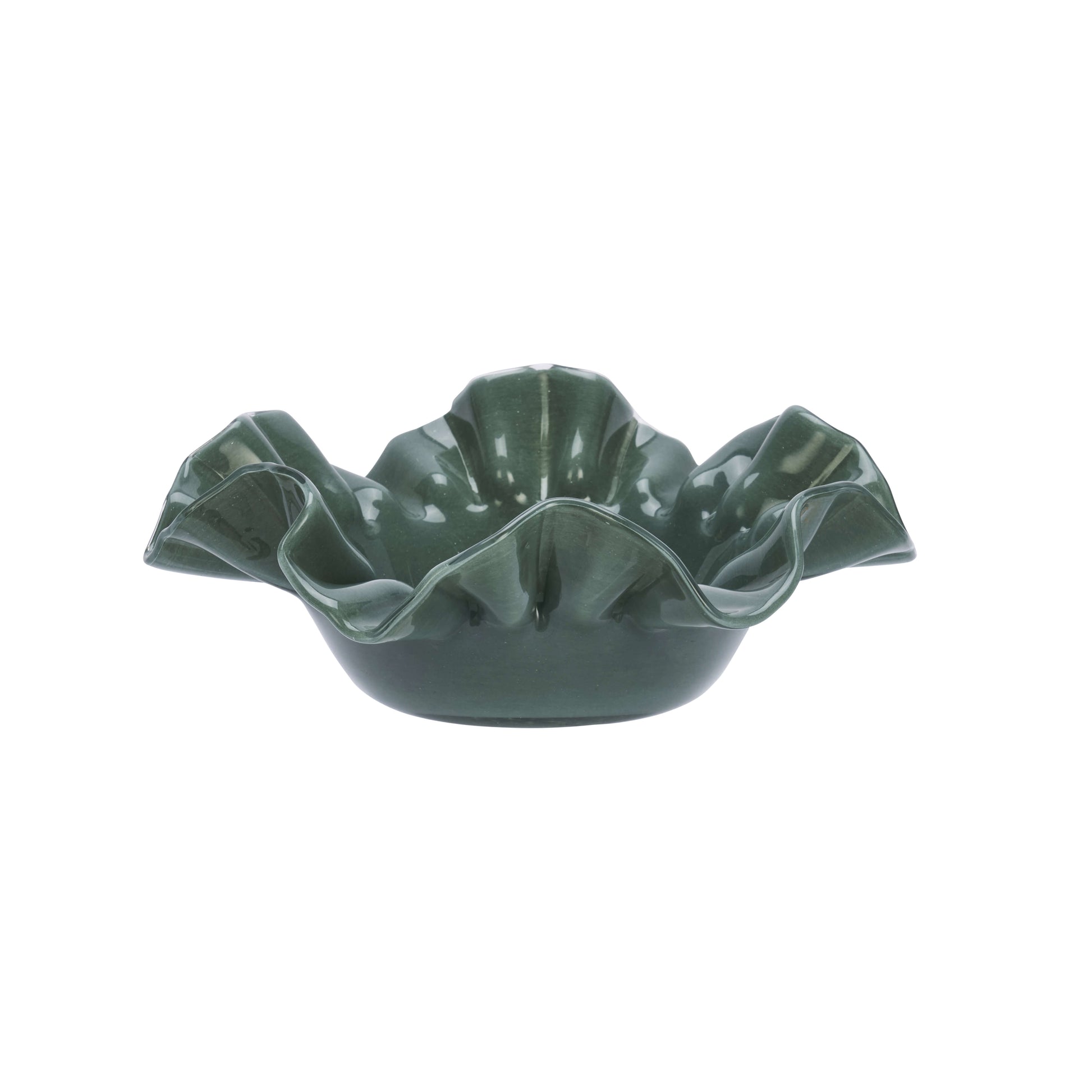 Ce bol en verre vert allie l'inspiration Art déco à une fonctionnalité moderne. Il présente un bord festonné distinctif et un design éclatant, ce qui en fait un plat idéal pour présenter des fruits et un objet décoratif polyvalent.