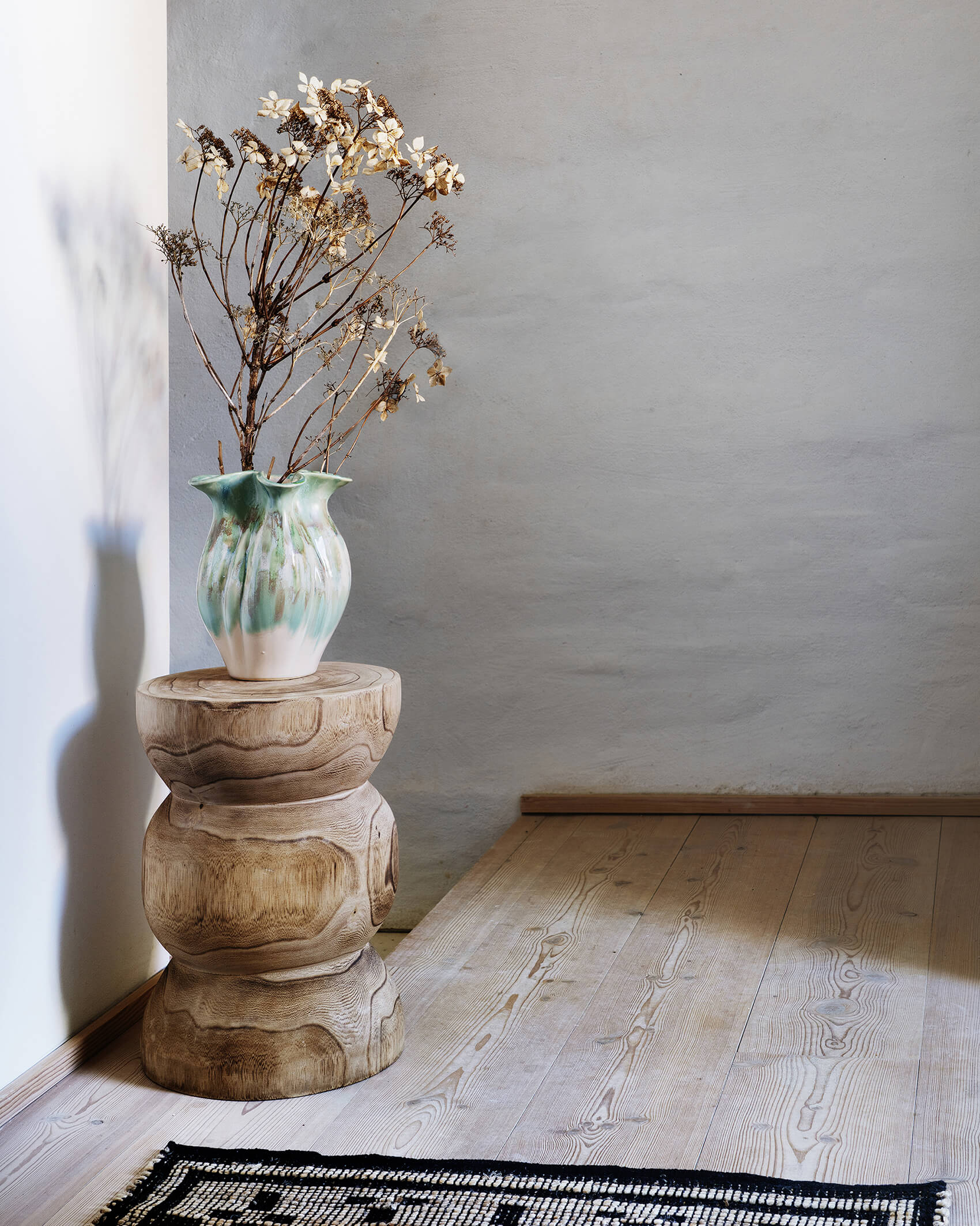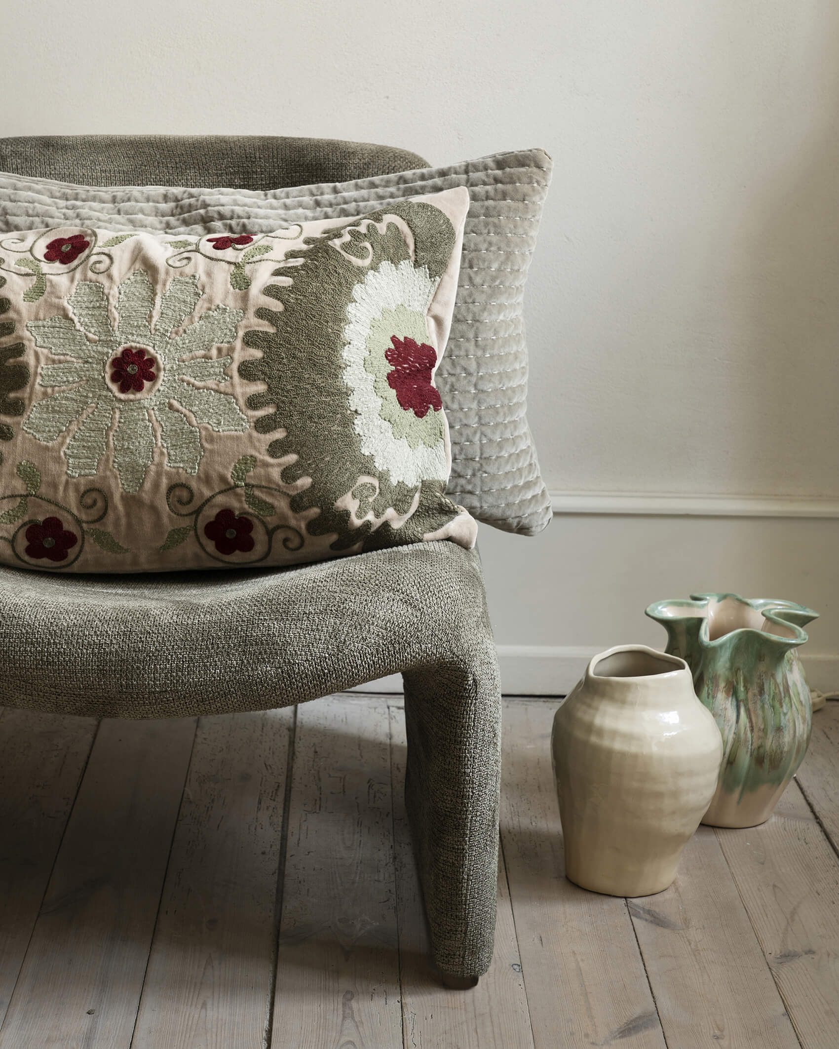 Ce vase en grès, d'inspiration années 50 arbore des teintes vert clair, beige et blanc cassé. Son design sculptural, à la fois élégant et unique, présente des variations de couleur et de motif dues à la décoration artisanale et à l'émail réactif.