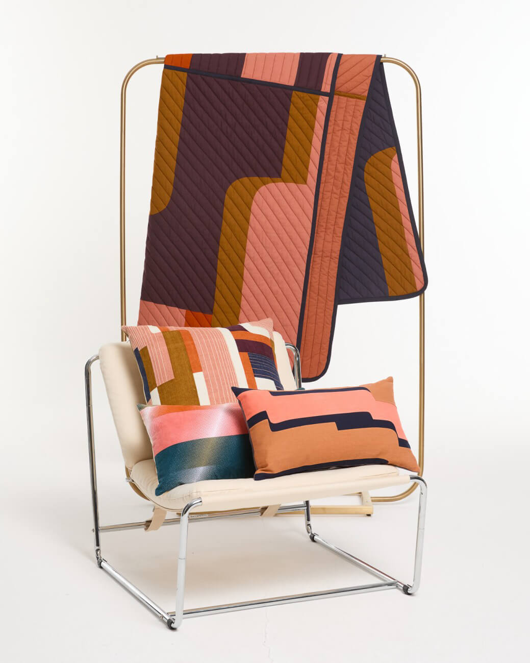 Housse de coussin graphique en soie sauvage , imprimé Petra dans les tons bois de rose, terracotta clair, ocre, écru et navy.