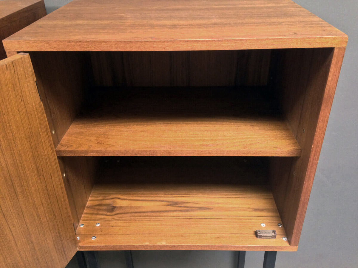 Meuble teck huilé pieds metal / 1 porte ouverture lattérale.
