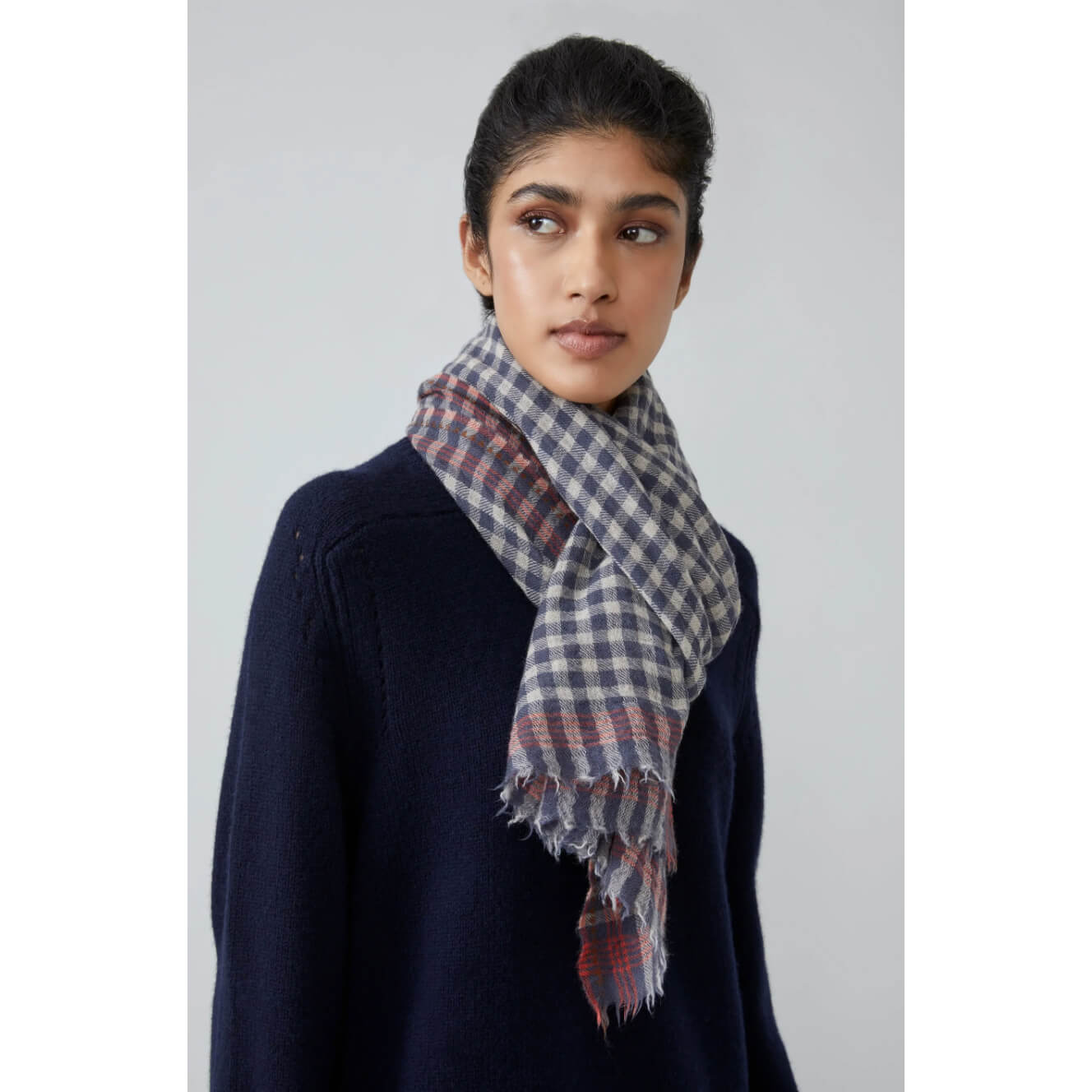 Fait main en 100% laine, carreaux Vichy tissés-teints, fines rayures contrastes aux extrémités et "M" brodé.