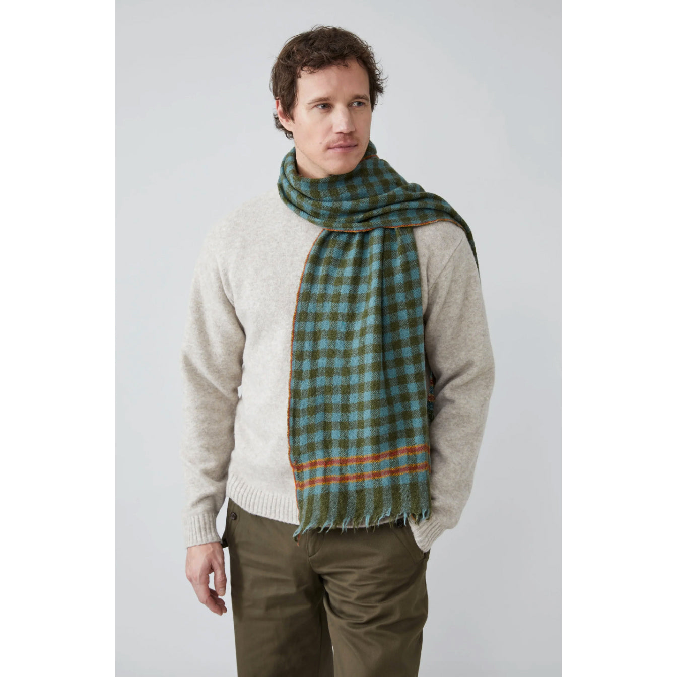 Fait main en laine & soie, carreaux Vichy tissés-teints, rayures contrastes aux extrémités et logo "M" brodé.