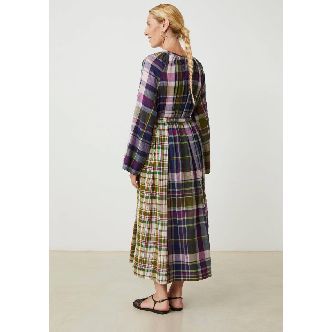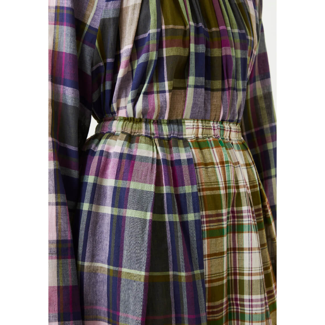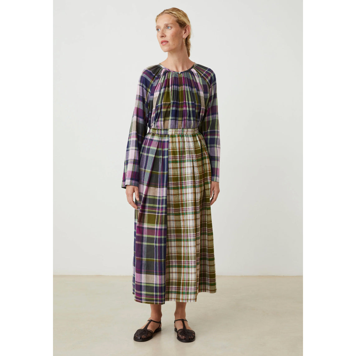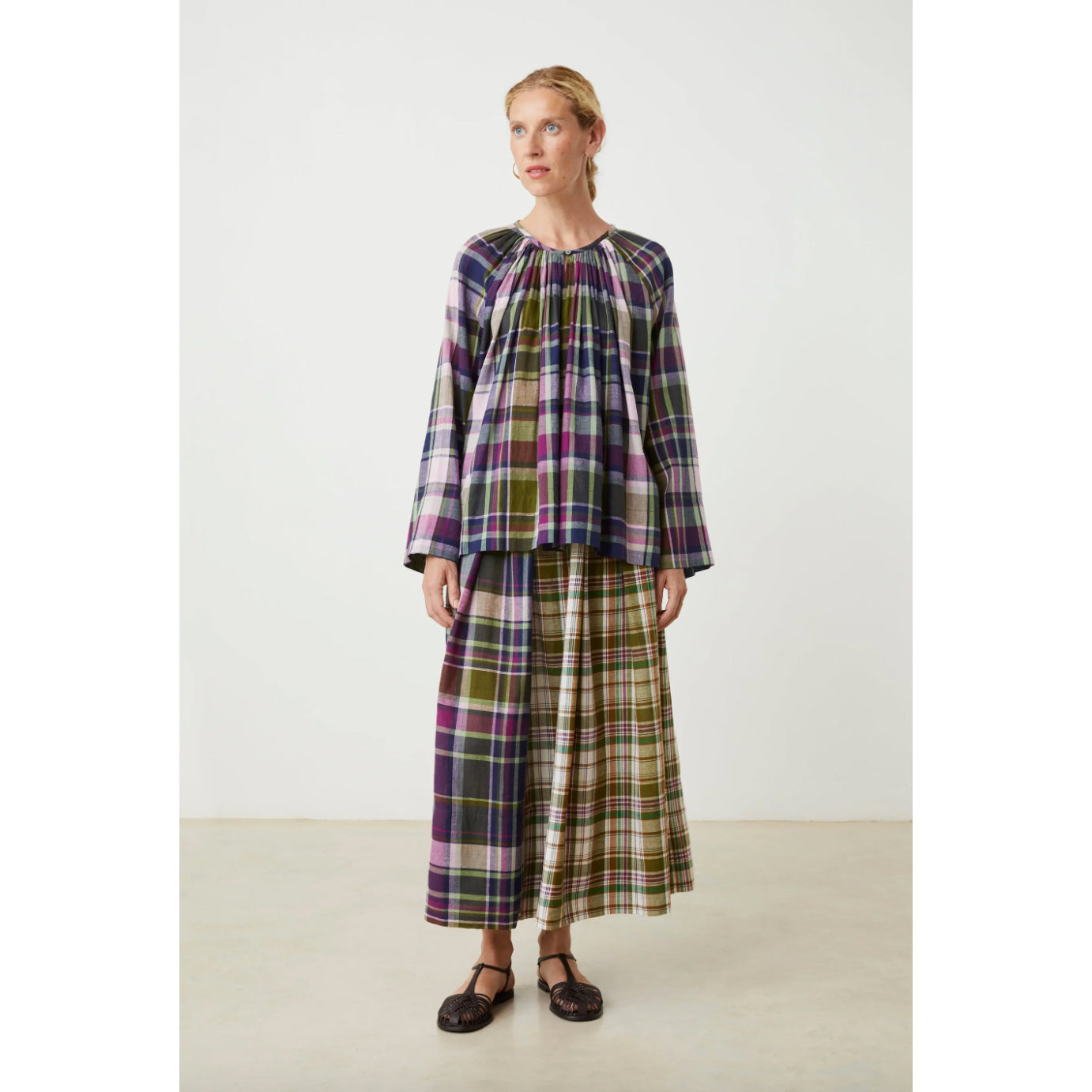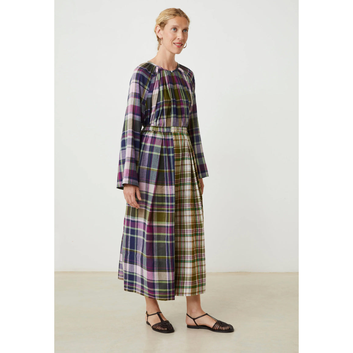 Jupe longue ample à plis larges, patchwork de grands carreaux madras