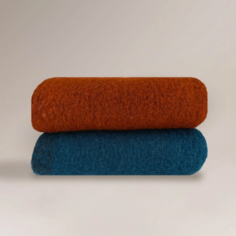 Coloris brique, bleu ciel et bleu pétrole, finitions côtés gris chiné.
