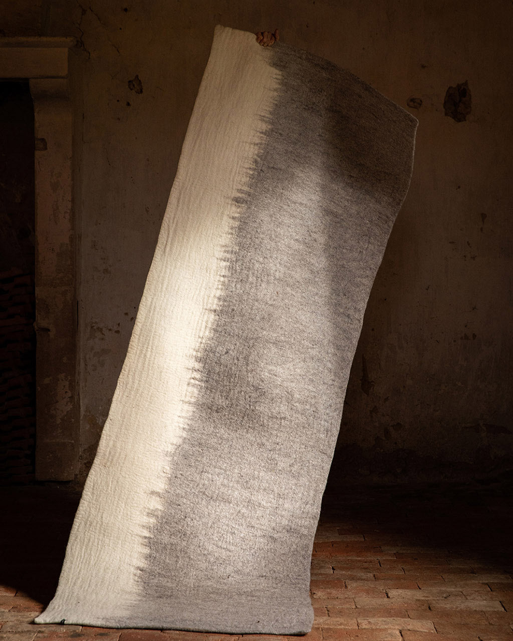 Sa fabrication est entièrement artisanale. A partir de laine de mouton cardée, d’eau et de savon, un long travail de pression et de friction permet aux fibres de laine de s’entrelacer pour obtenir une matière moelleuse, à la douceur généreuse.