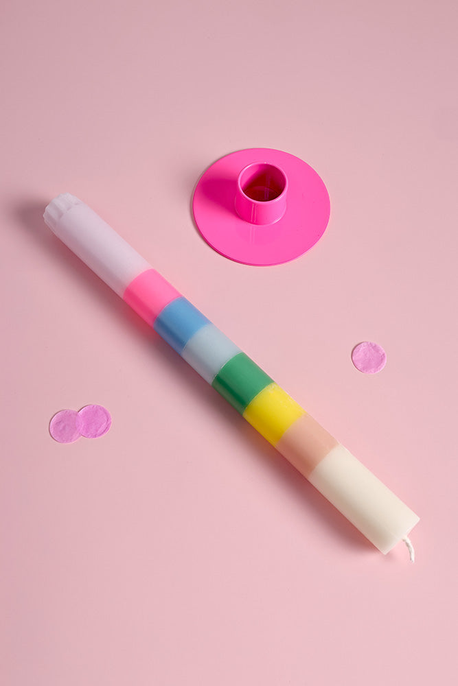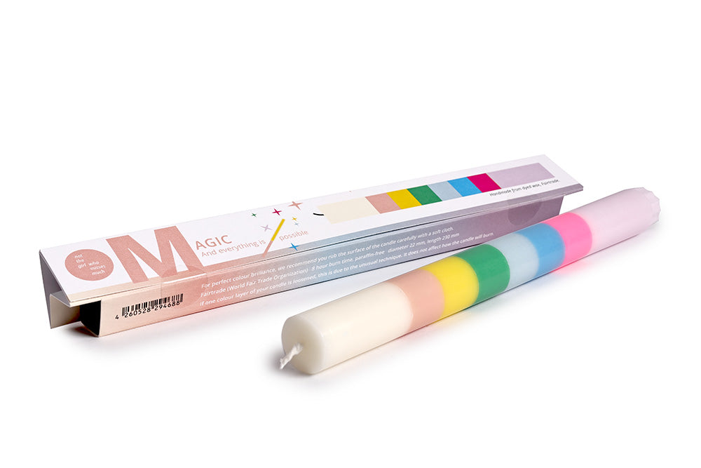 Minimalistes et aux couleurs éclatantes, nous avons mis en place dans nos bougies des codes de couleur qui se rapportent à différents aspects de la vie. Chaque bougie devient ainsi un message et un cadeau qui transmet des félicitations et des vœux. Chez nous, chaque thème a sa bougie et chaque bougie est un nouveau thème. Les bougies sont fabriquées à la main à partir de cire végétale de couleur unie.