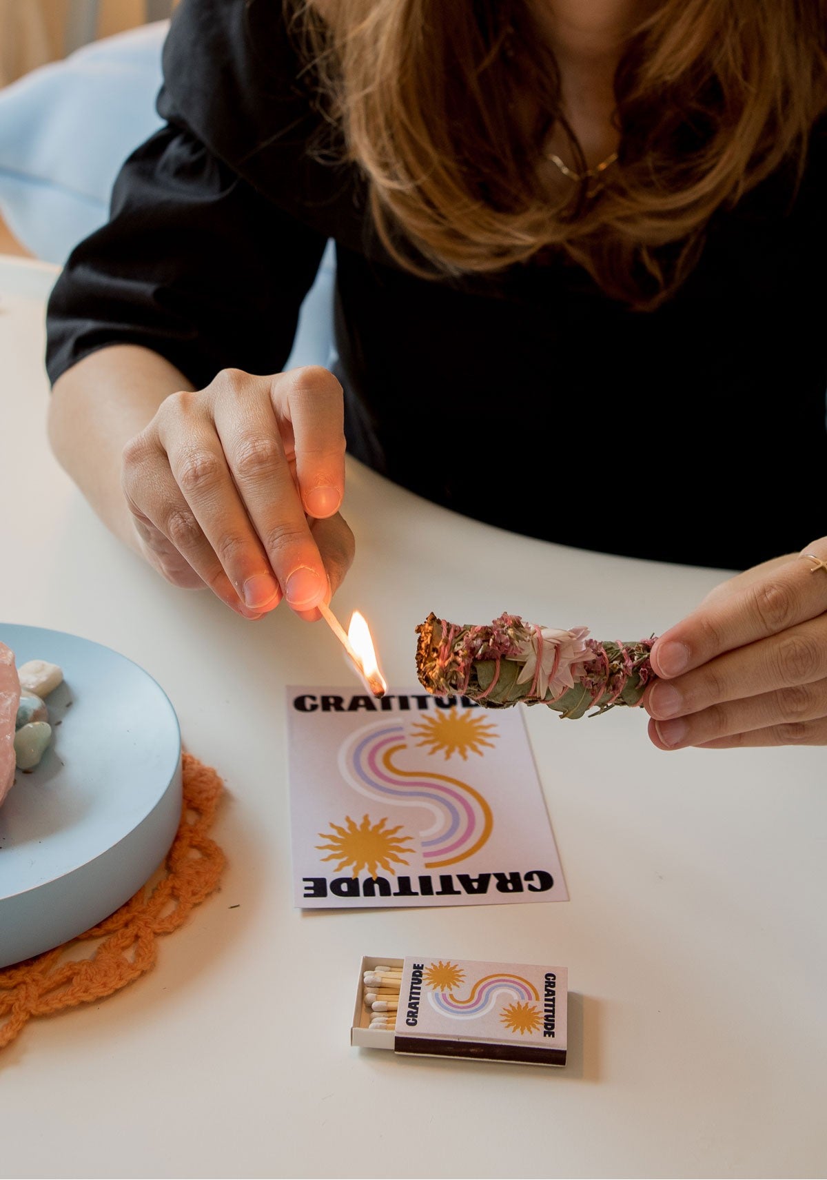 C'est lors d'une soirée hivernale un peu grise, que les deux créatrices et amies ont imaginé un objet qui soulagerait nos âmes et qui allierait fun et spiritualité.Le bâton de fumigation sacré présenté sur un support drôle et dans l'air du temps est né !