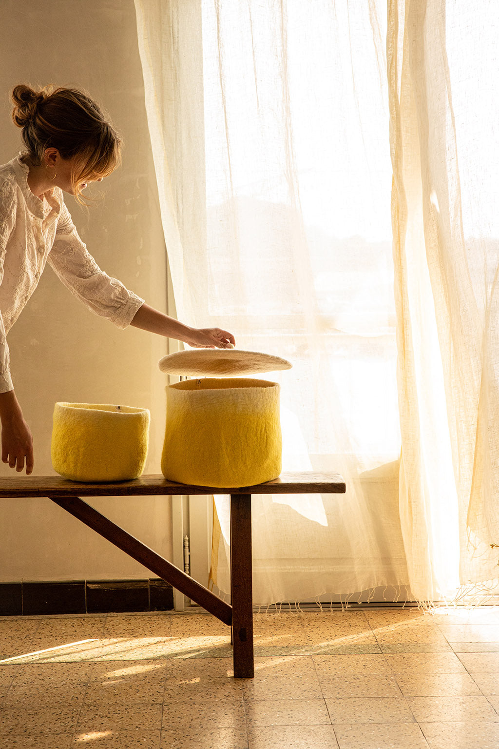 Rangement calebasse en feutre M - Citron/naturel