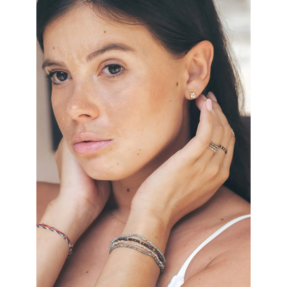 Chaque pièce est ornée de pierres naturelles, rendant chaque bijou unique par la variation subtile des formes et des couleurs.