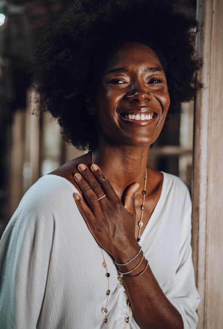 Chaque pièce est ornée de pierres naturelles, rendant chaque bijou unique par la variation subtile des formes et des couleurs.