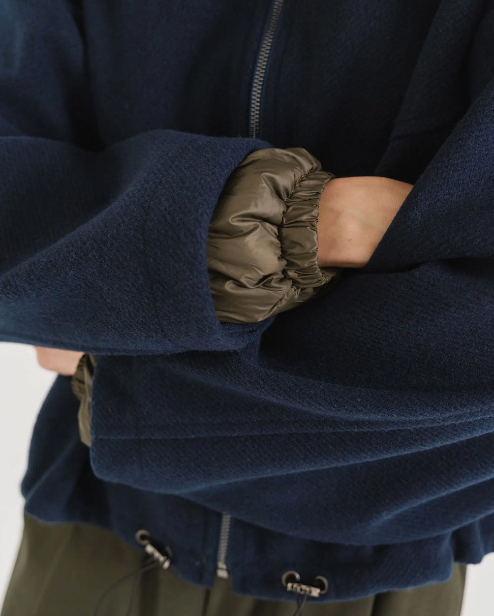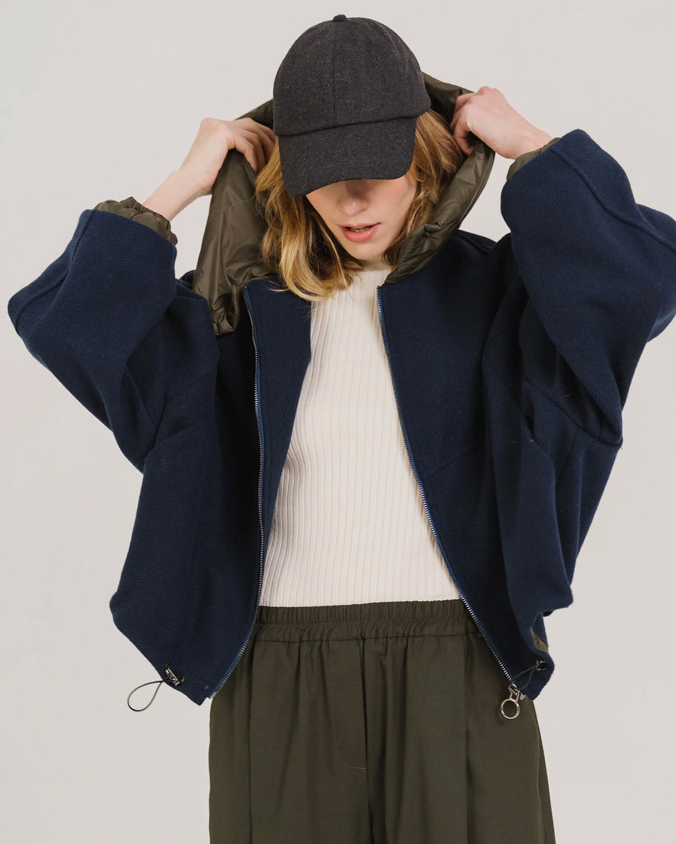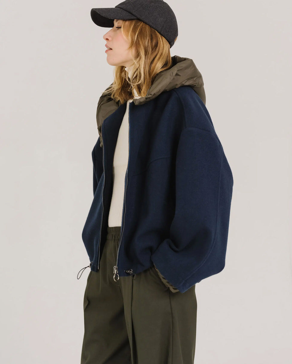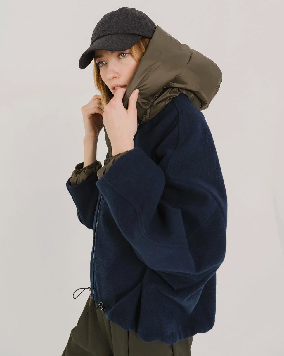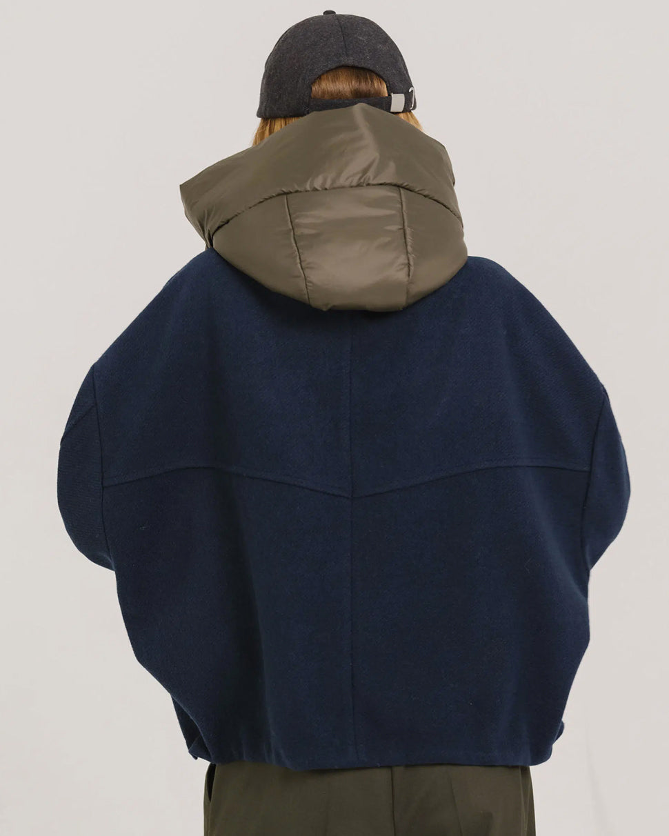 Blouson en lainage technique, loose avec capuche et bas de manche en nylon.
