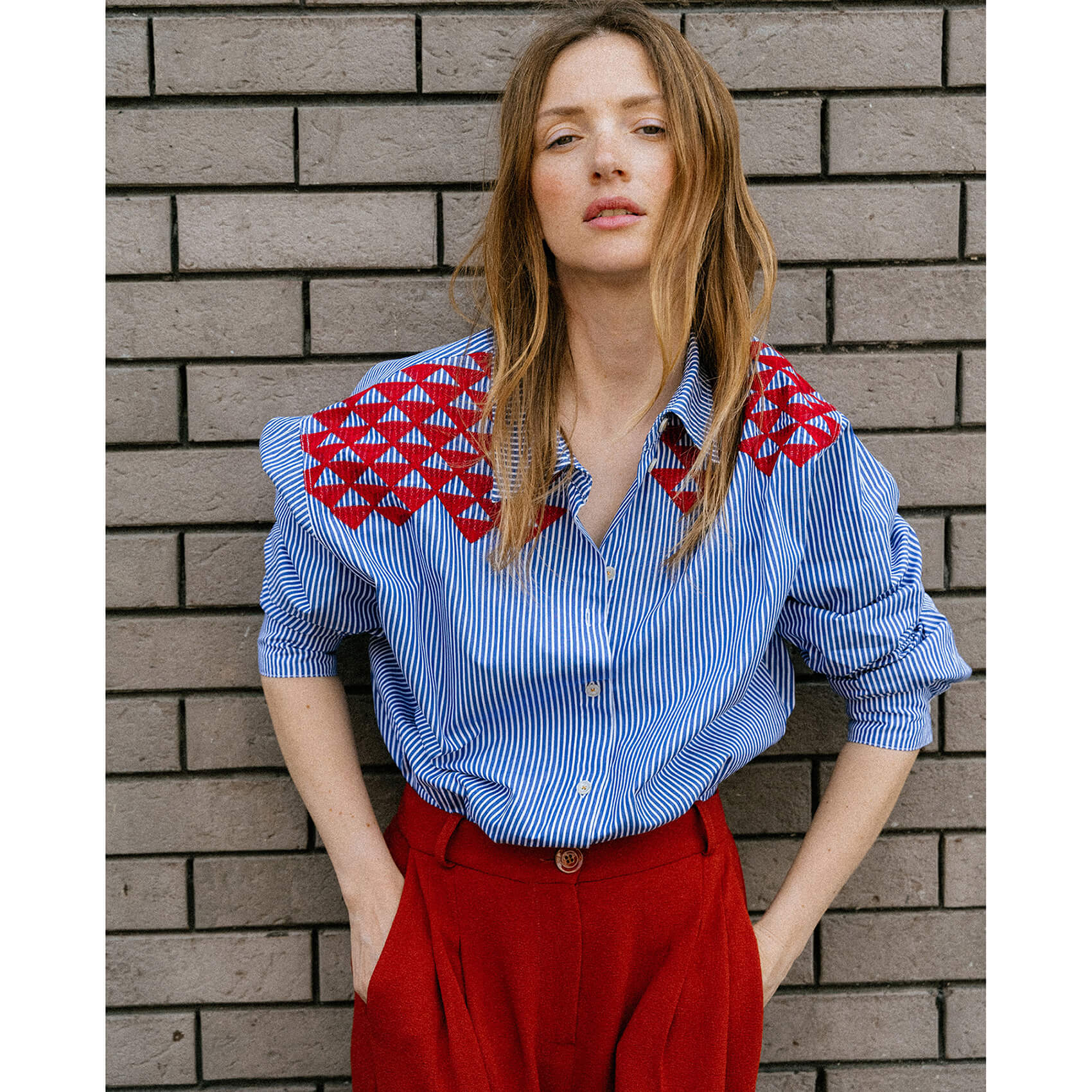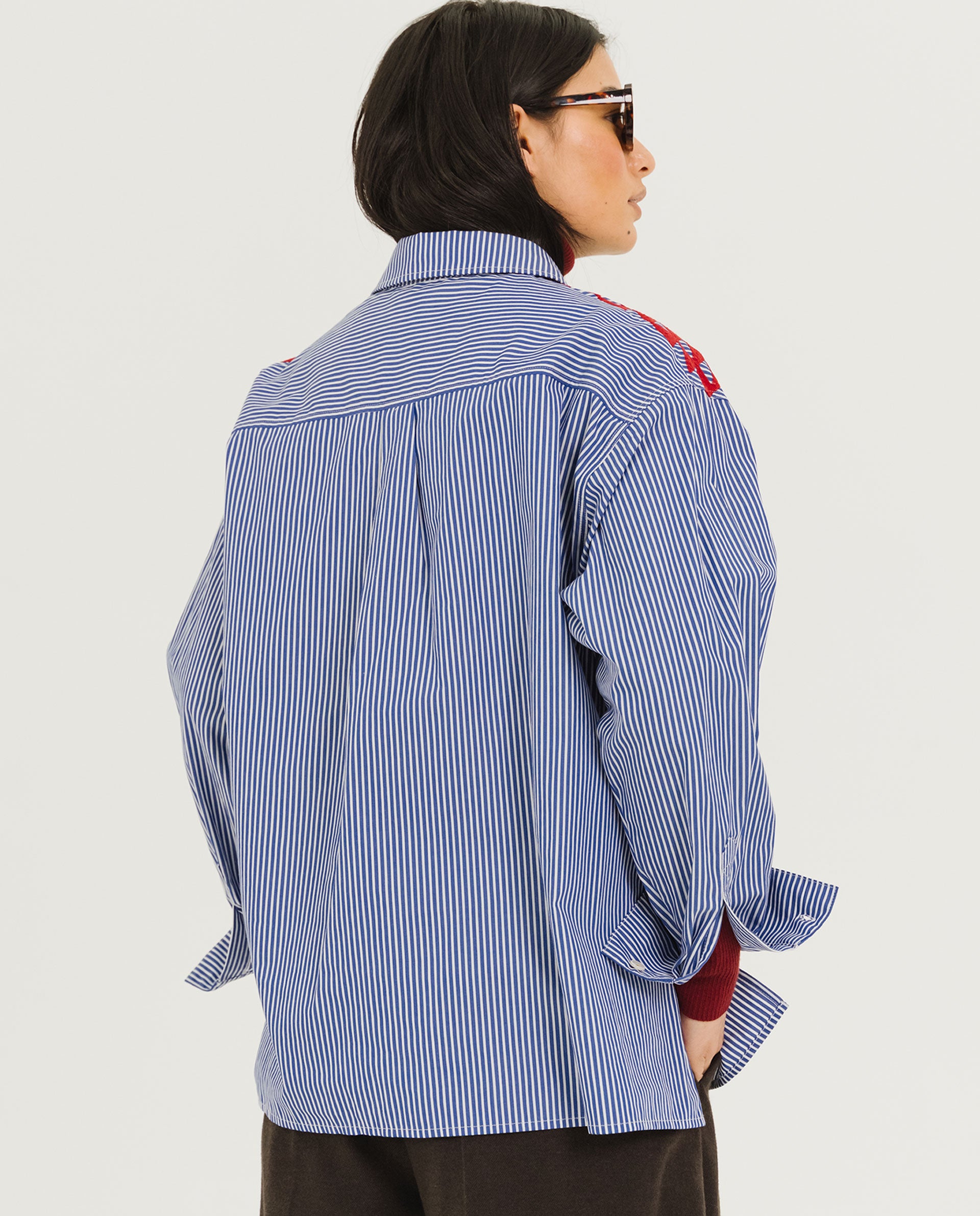 Chemise à l’esprit “boyish”, coupée dans une belle popeline de coton rayée bleue et blanche, rebrodée aux épaules en rouge.