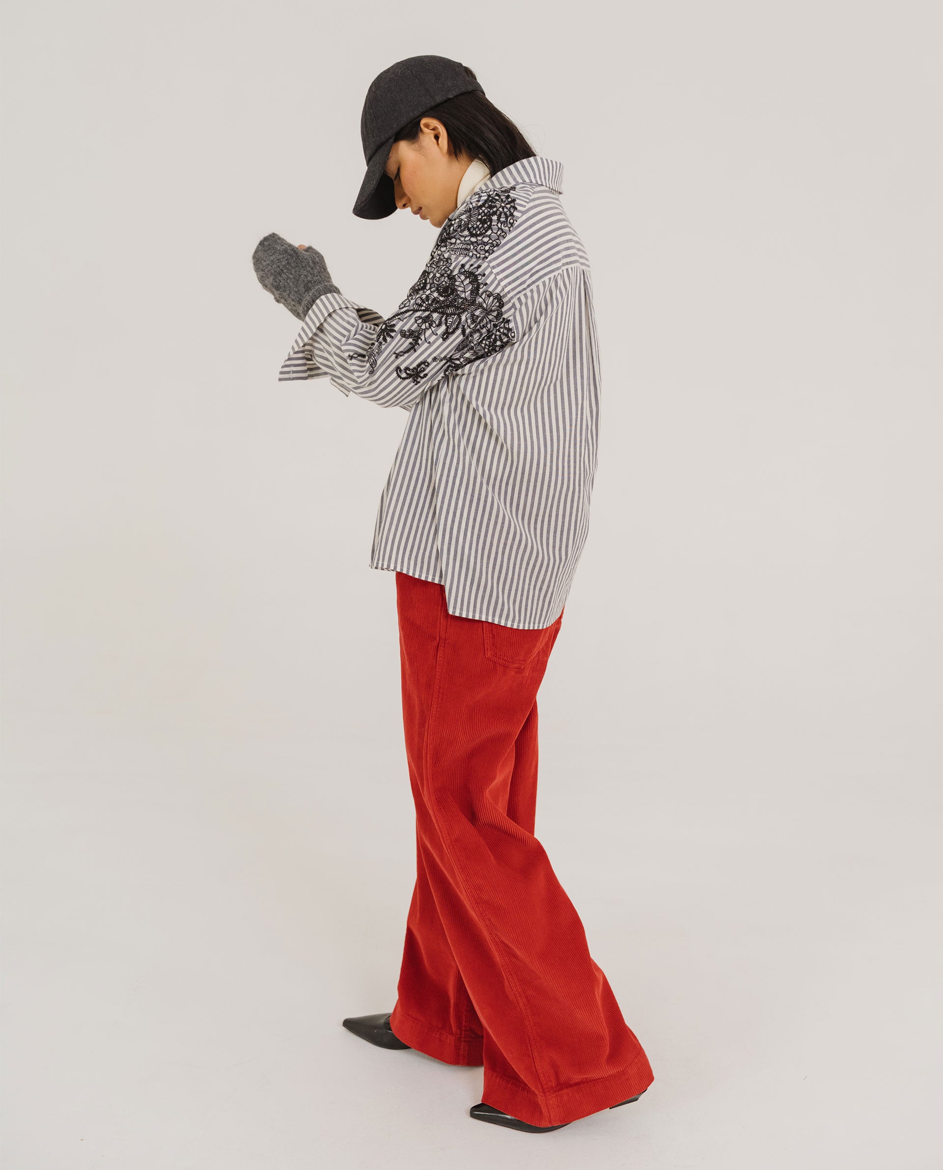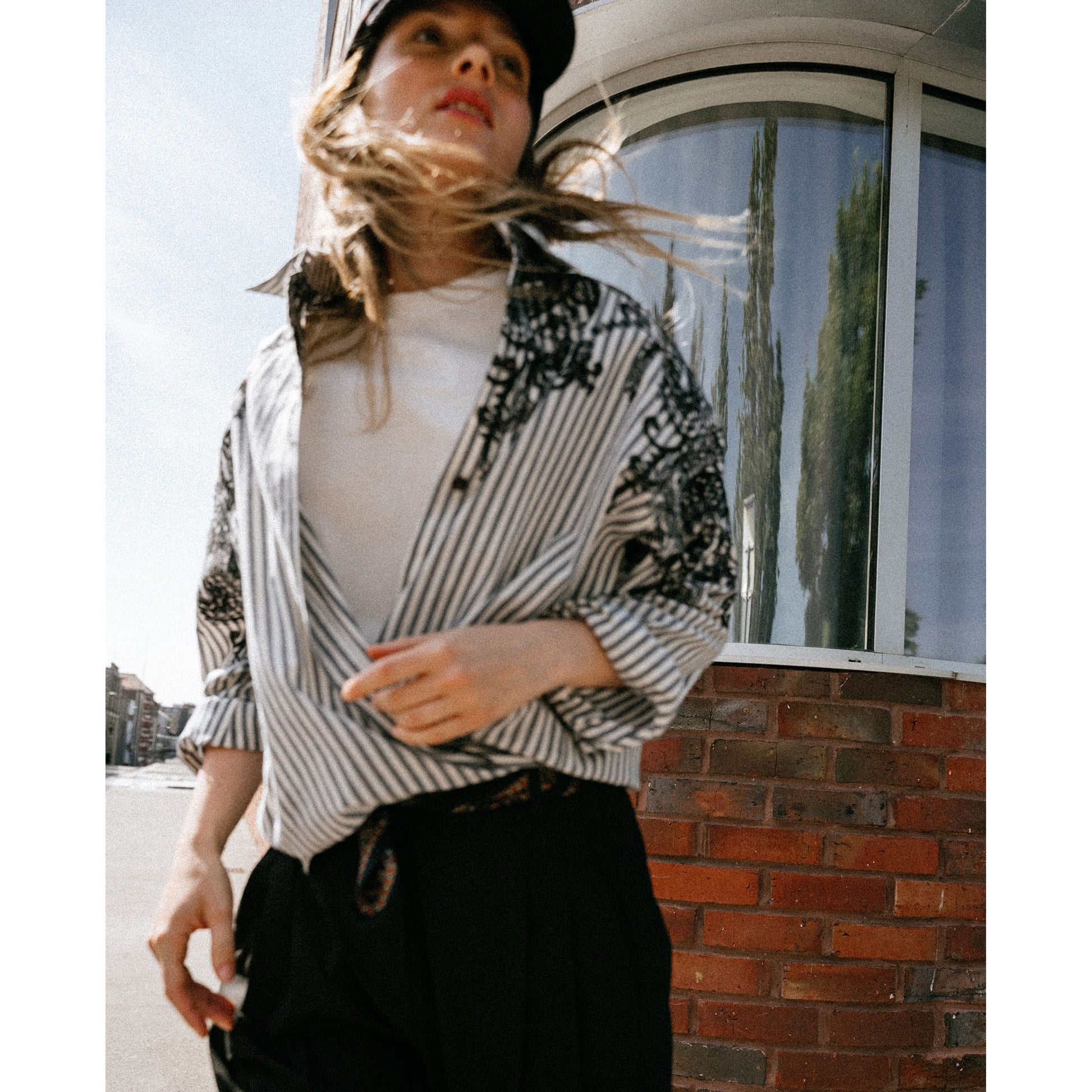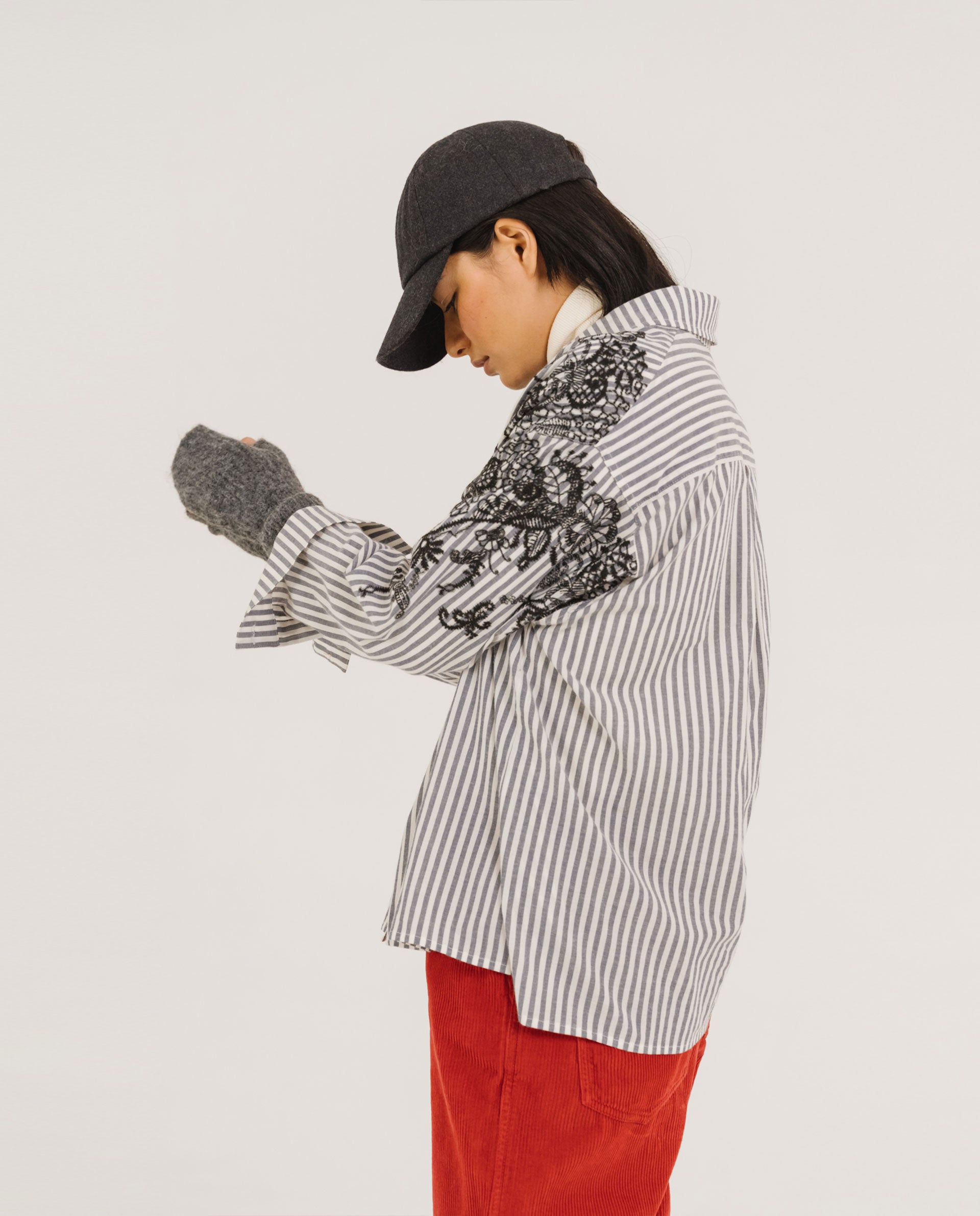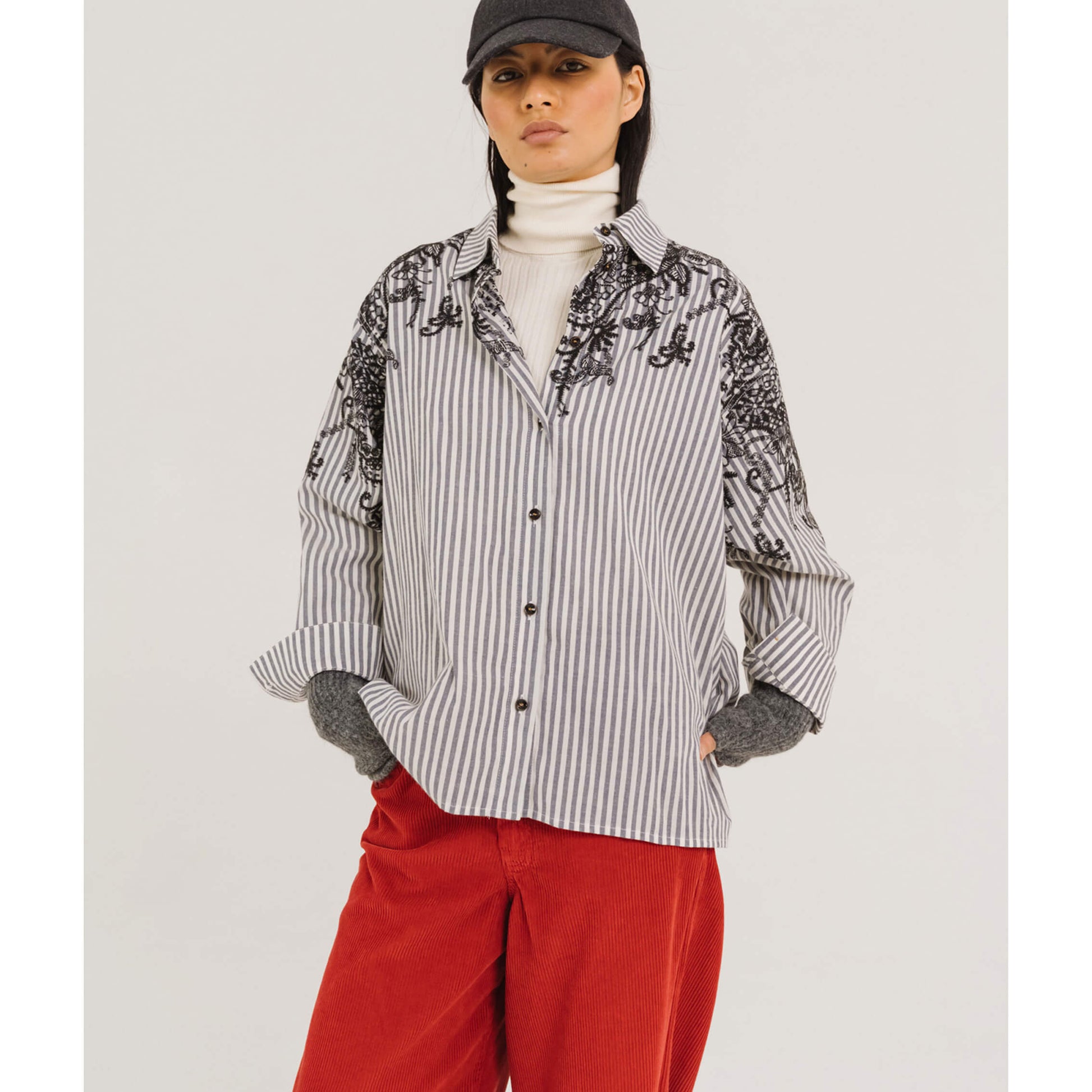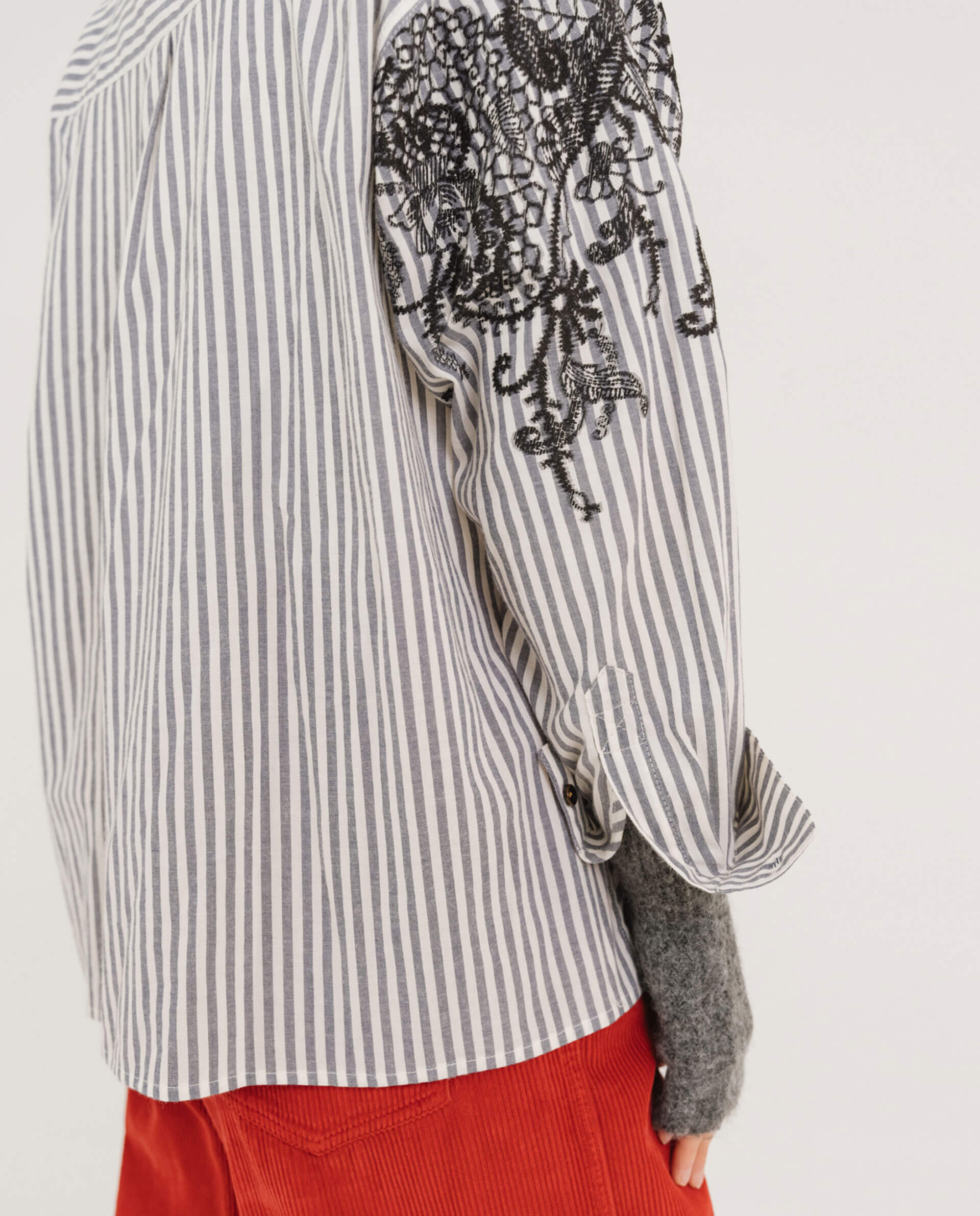 Chemise à l’esprit “boyish”, coupée dans une popeline avec motif Jacquard placé.