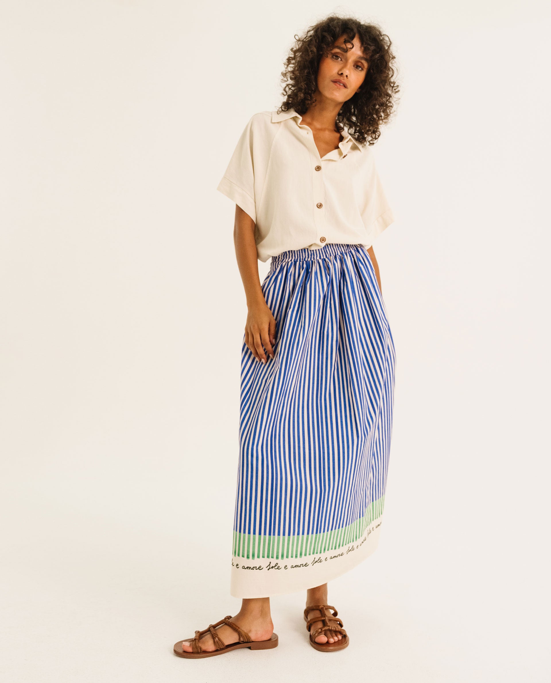 Christie est une jupe longueur midi élastiquée au devant et au dos.